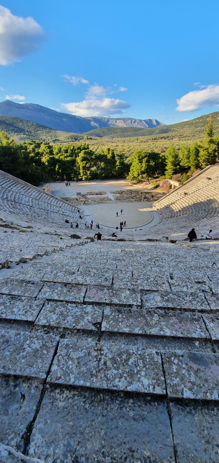 60 mètres séparent le dernier rang de gradins de l’orchestra (où évoluait le choeur). Pourtant le spectateur peut entendre le bruit d’un froissement de feuille ! La disposition même des gradins favorise l’acoustique : le bruit ambiant constitué de sons de basse fréquence est réduit tandis que les sons de haute fréquence, dont les voix des acteurs, sont mieux portés.