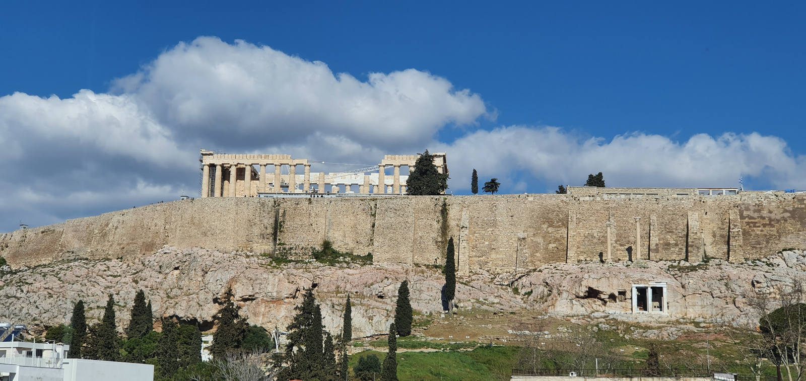 Le Parthénon domine la colline. Particulièrement endommagé en 1687 par un boulet de canon, le temple fait l’objet d’une restauration minutieuse depuis le XXe siècle. Au pied de ce côté de l’Acropole se trouvaient plusieurs sanctuaires dont celui de Dionysos. On distingue en bas à droite l’encadrement dorique des deux portes du monument chorégique élevé en 320 avant J.-C. par Trasyllos, chorège vainqueur des concours de représentations théâtrales. Deux colonnes corinthiennes le surplombent.
