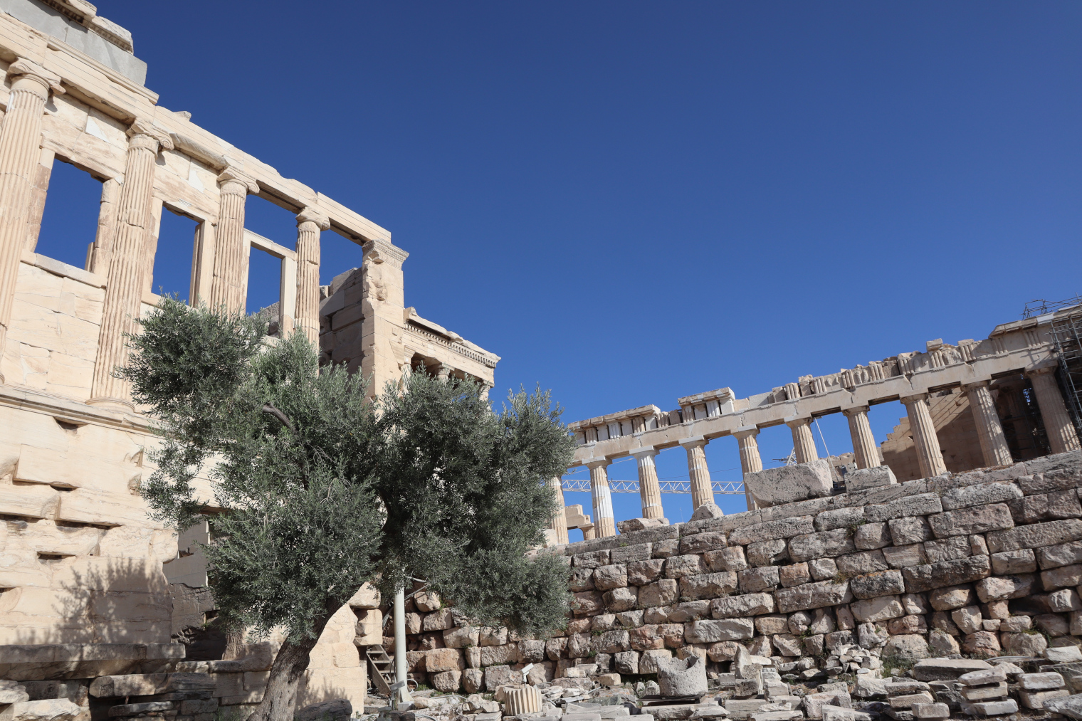 Au premier plan, l’olivier sacré rappelle la victoire d’Athéna sur Poséidon pour la possession de l’Attique. Poséidon qui, grâce à son trident, avait fait jaillir une source d’eau salée (ou un cheval suivant les traditions) ne fut pas choisi. On préféra Athéna Polias « qui protège la cité » puisqu’elle offrait le bois et l’huile de l’olivier, devenu symbole de la sagesse.