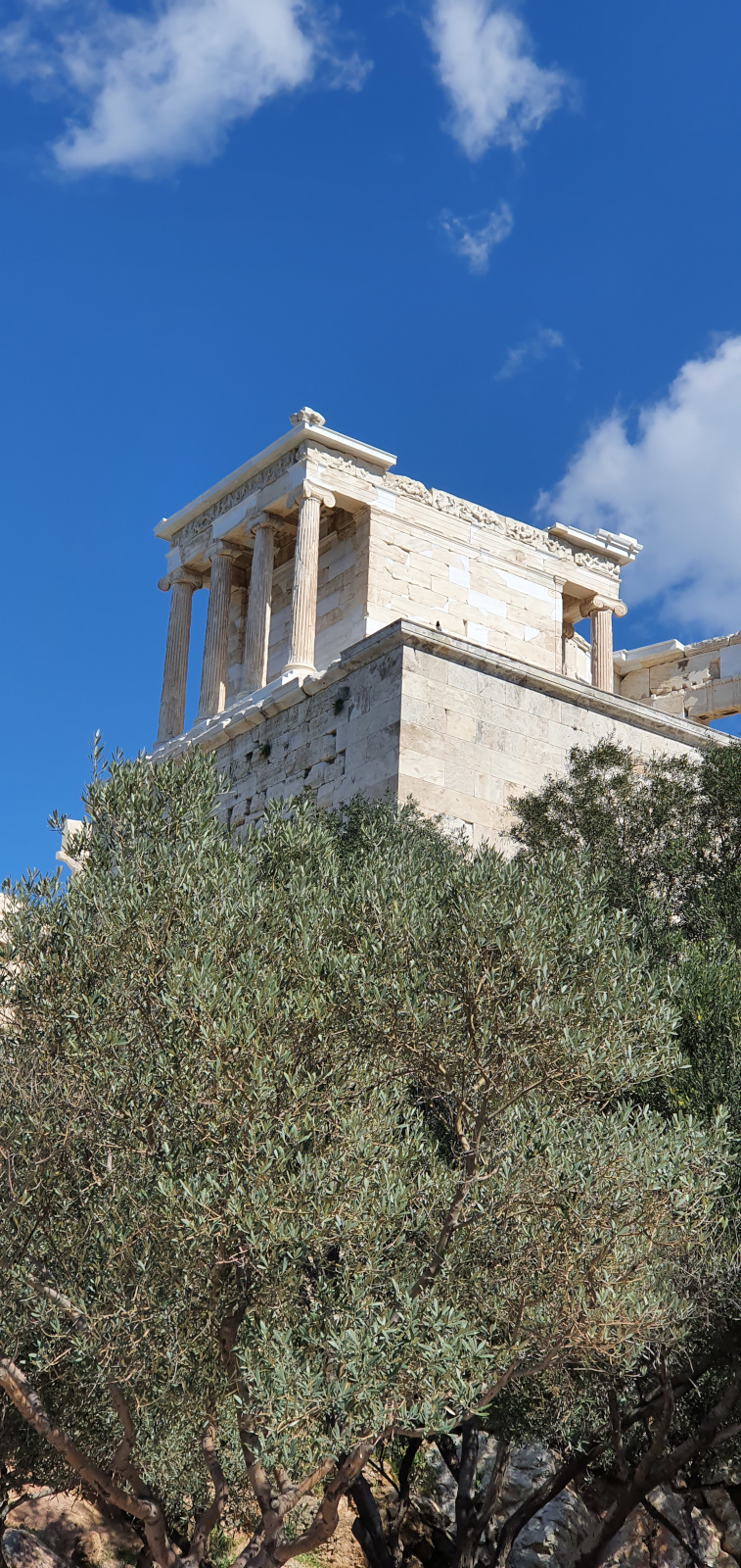 À droite des Propylées, ce petit temple en marbre dont la décoration fut achevée en 410 avant J.-C est d’ordre ionique. Deux rangs de quatre colonnes sur les façades ont été remontés en 1835. Il est aussi appelé Temple de la Victoire Aptère « sans ailes » pour que, dit-on, la victoire ne quitte jamais la cité. Une frise presque en haut-relief orne son sommet. Celle du côté est, d’origine, présente Athéna aux côtés de Zeus et d’une assemblée de divinités.