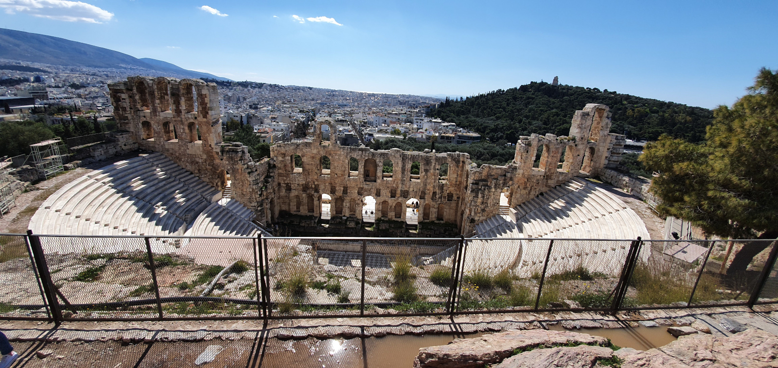 Ce petit théâtre qui peut accueillir jusqu’à 5000 spectateurs a été construit en 161 par Hérode Atticus, rhéteur fortuné venu apprendre le latin à Rome. La cavea est soutenue par des contreforts. On pense que les gradins étaient protégés d’un toit en cèdre. Les niches de la façade recouverte de marbre abritaient des statues. Le dallage bicolore en marbre de l’orchestra a été conservé. Aujourd’hui, le festival d’Athènes y produit des tragédies classiques.