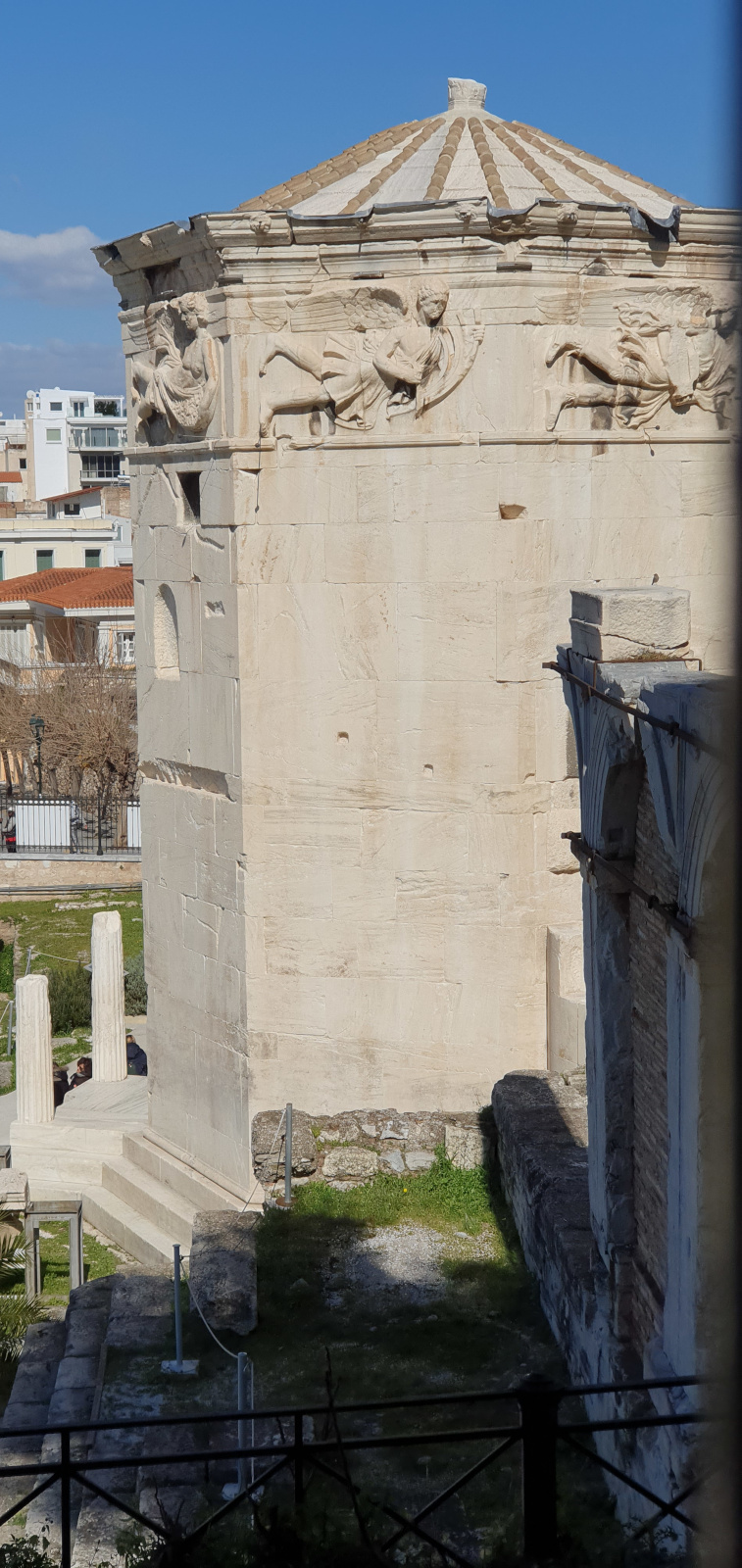 Construite par un architecte syrien au Ier siècle avant J.-C., la tour octogonale en marbre s’élève à plus de 12 mètres de haut. Surmontée d’un triton-girouette, elle indiquait la direction des vents, l’heure, et les solstices. La frise supérieure est ornée de bas-reliefs représentant des allégories des vents. On voit ici à gauche le doux Zéphyros, au centre Lips vent du Sud-Ouest, à droite le tempétueux Notos. Sous la domination ottomane, des derviches tourneurs s’installèrent dans la tour.