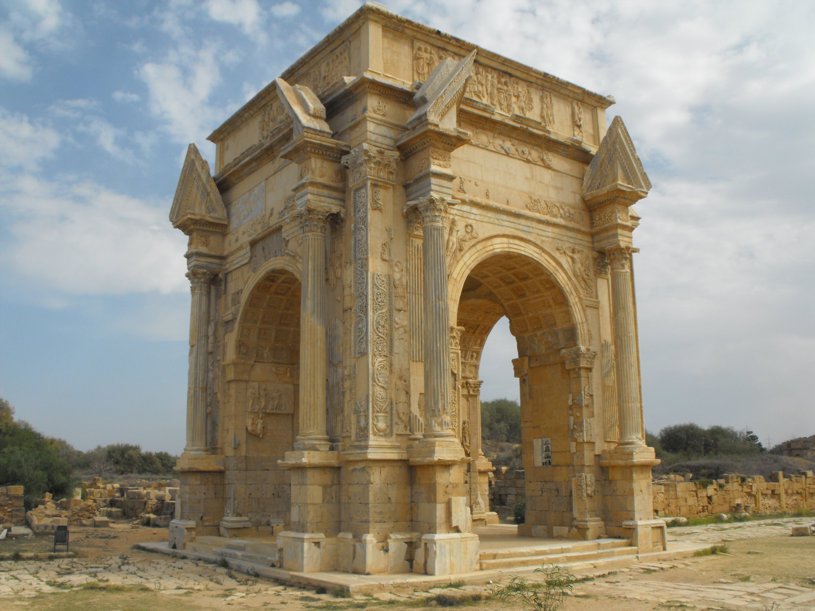 Cet arc de triomphe quadrifons, percé de quatre portes de 20 m de haut, mesure 40 m × 40 m et possède trois étages. Les décorations représentent des frises de vigne, des victoires ailées, des scènes de sacrifice, de bataille et une cérémonie triomphale en l’honneur de Septime Sévère et ses fils, à côté de Jupiter et Junon représentés sous les traits de l’Empereur et de sa femme. Elles célèbrent les vertus de la famille impériale – paix, concorde, piété – et ont une visée de propagande.