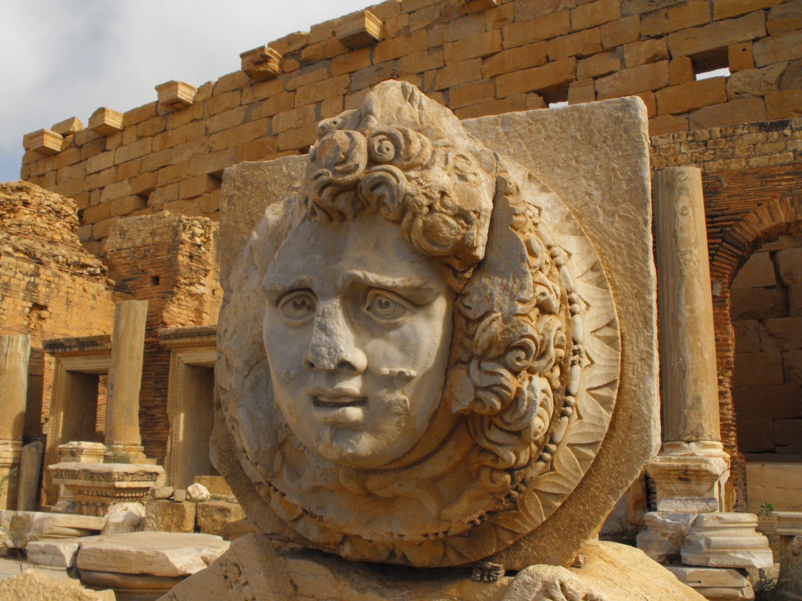 Créatures effrayantes et maléfiques de la mythologie, les Gorgones étaient trois sœurs capables de pétrifier celui qui les regardait. Leur demeure se trouvait au-delà de l’Océan ou en Lybie selon d’autres traditions. Cette représentation trouvée sur le forum de Septime Sévère ornait sans doute un monument sans manquer d’effrayer les ennemis.