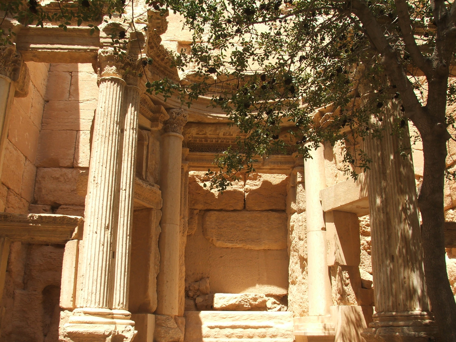 La foisonnante décoration de l’intérieur du temple mêle librement les influences hellénistique et orientale. La divinité demeurait au fond d’une niche de la cella, salle centrale de l’édifice sacré inaccessible aux fidèles. Le dieu la quittait cependant à l’occasion de processions solennelles : son image était alors abritée dans une niche portative, la qobba hissée sur le dos d’un chameau et promenée à travers la ville.