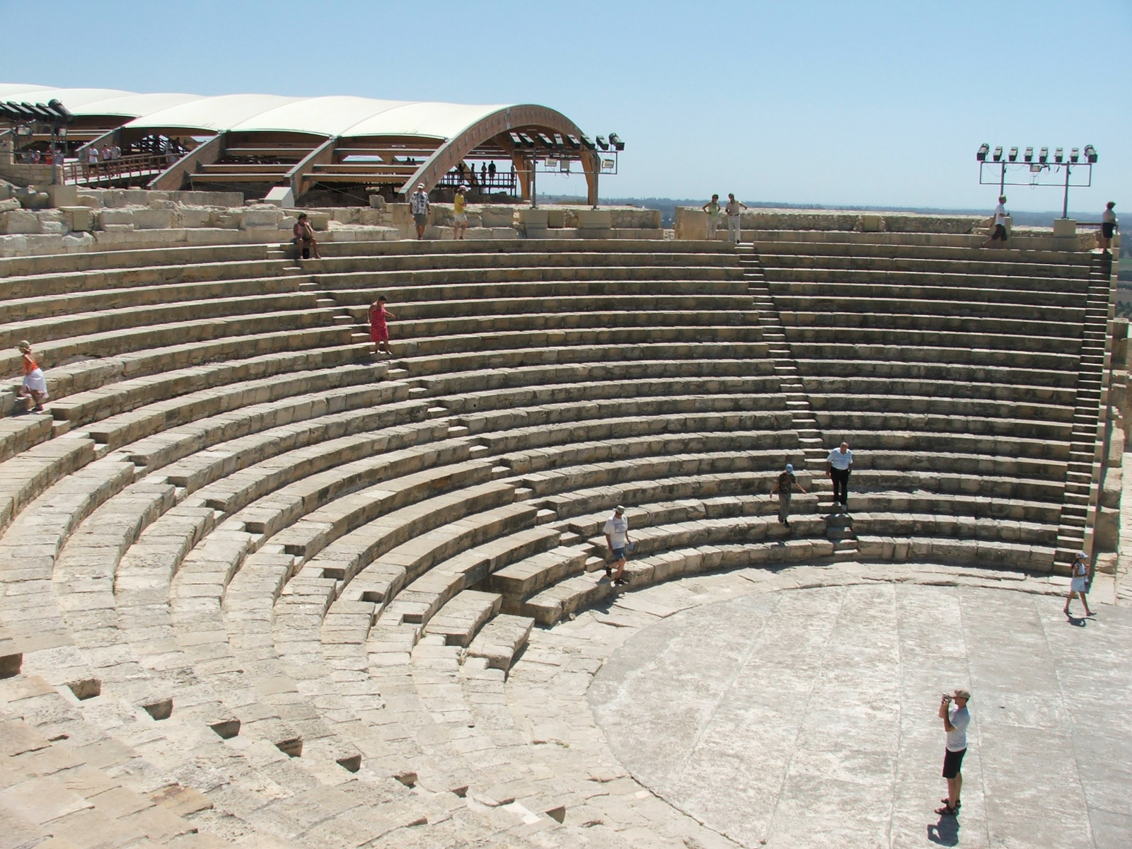 Le théâtre grec de Kourion épouse les formes naturelles du terrain et joue avec la beauté du site en plaçant les spectateurs face à la mer. Les Romains y élèvent un mur de scène qui cache la vue et le transforment en arène pour accueillir des combats de gladiateurs. Le théâtre peut accueillir jusqu’à 7000 spectateurs.