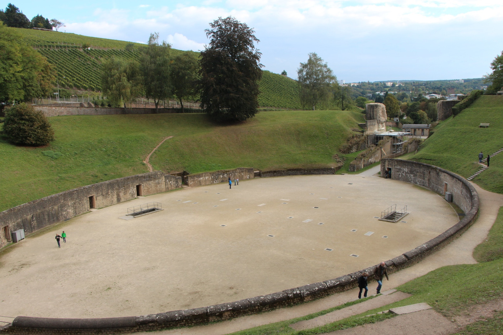 Construit aux alentours de 100 après J.-C., l’amphithéâtre reçut des améliorations et un riche décor au cours des siècles suivants. Il comptait parmi les dix plus grands amphithéâtres romains. Il pouvait accueillir de 20 à 25 000 spectateurs. Au Moyen Âge, il servit de carrière, comme de nombreux autres édifices. Au XVIIIe siècle, les gradins étaient en si mauvais état qu’on y pratiqua la culture de la vigne.