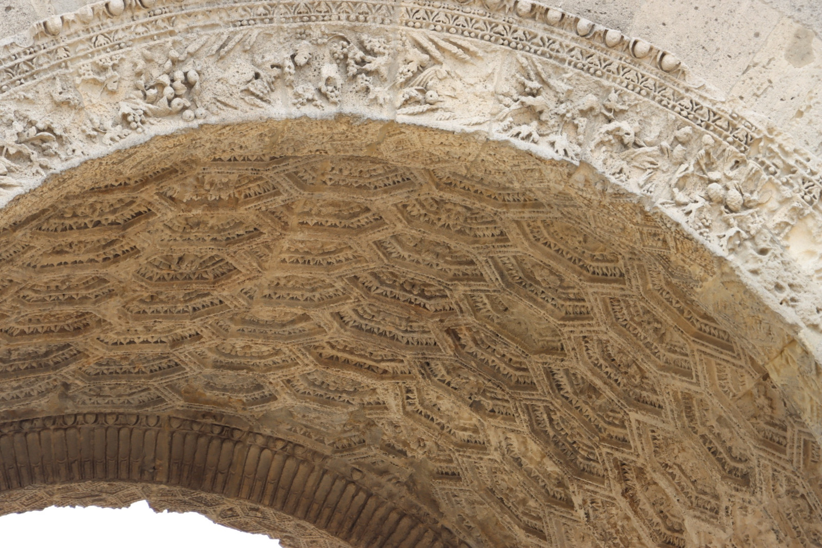 La décoration intérieure comme extérieure de l’arc est particulièrement soignée. Des guirlandes de fruits et d’épis de blé, symboles de prospérité, ornent les bordures des arches des portes. Les voûtes sont décorées d’un plafond à caissons avec des motifs géométriques hexagonaux à rosette centrale.