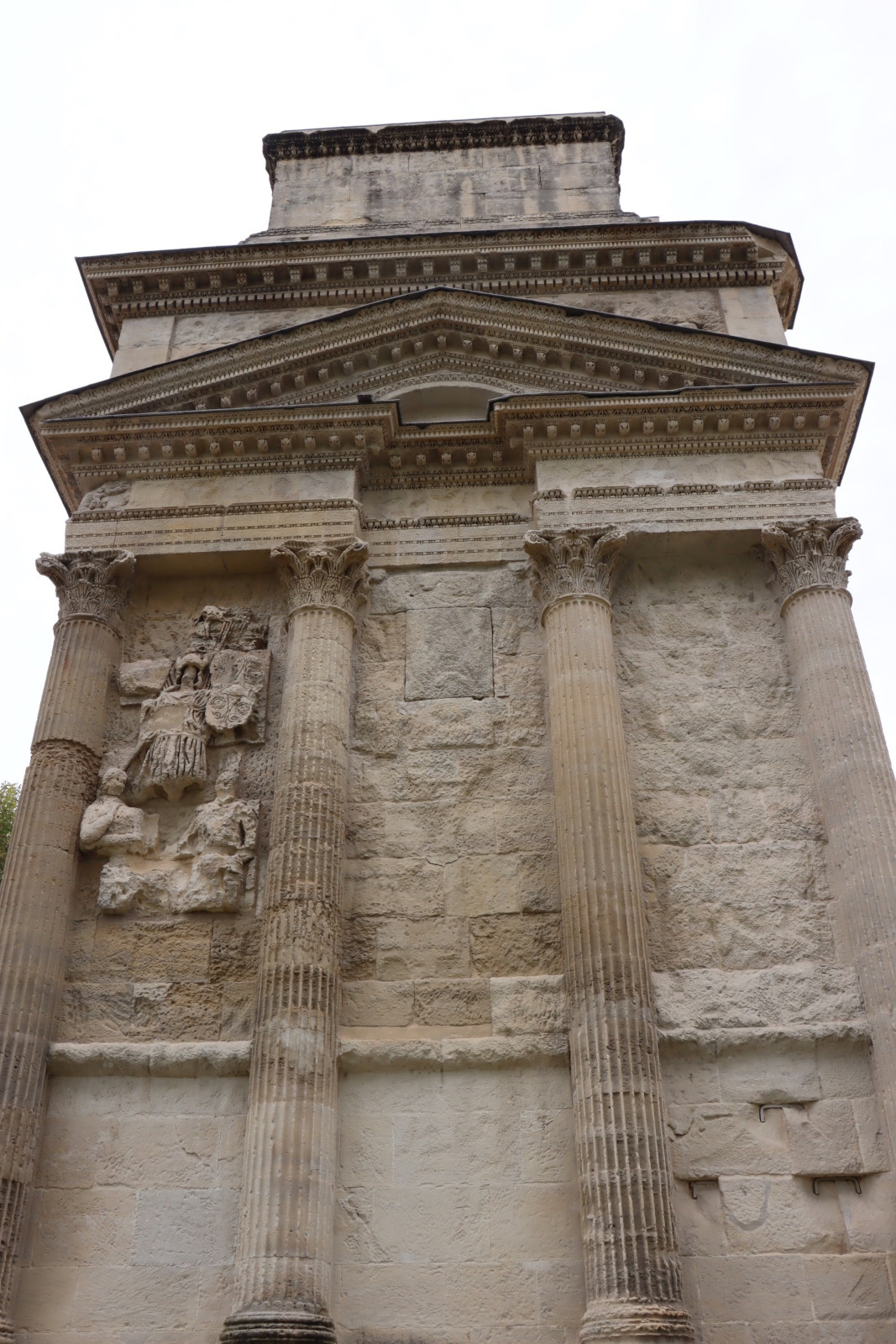 L’arc est formé de gros blocs de pierre montés à sec, maintenus par des crampons de fer et de plomb dont certains sont visibles. Sa structure architecturale reprend les éléments caractéristiques d’un temple : colonnes corinthiennes cannelées, fronton. L’inscription dédicatoire en lettres de bronze (aujourd’hui disparues) scellées dans la pierre sur les faces nord et sud montre que l’arc a été dédié à la gloire de Tibère en 26-27 ap. J.-C.