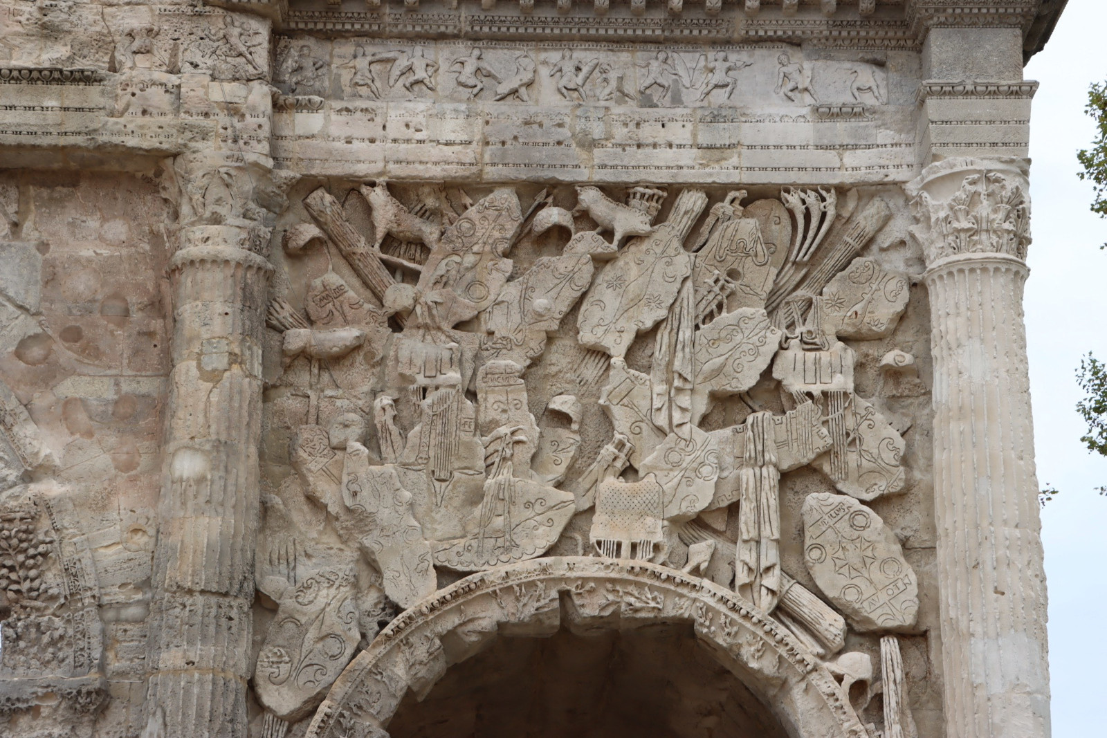 Au-dessus des arcs latéraux, quatre panneaux montrent un monceau décoratif de pièces d’armement prises à l’ennemi gaulois : casques, lances, boucliers, glaives, enseignes avec sangliers totémiques, trompes guerrières (carnyx). Certains boucliers portent des noms, Sacovir, Decurdus, Mario, peut-être ceux des sculpteurs ou d’armuriers renommés. Au-dessus se déroule une frise représentant des scènes de combats où les légionnaires romains s’opposent comme en duel aux guerriers gaulois.