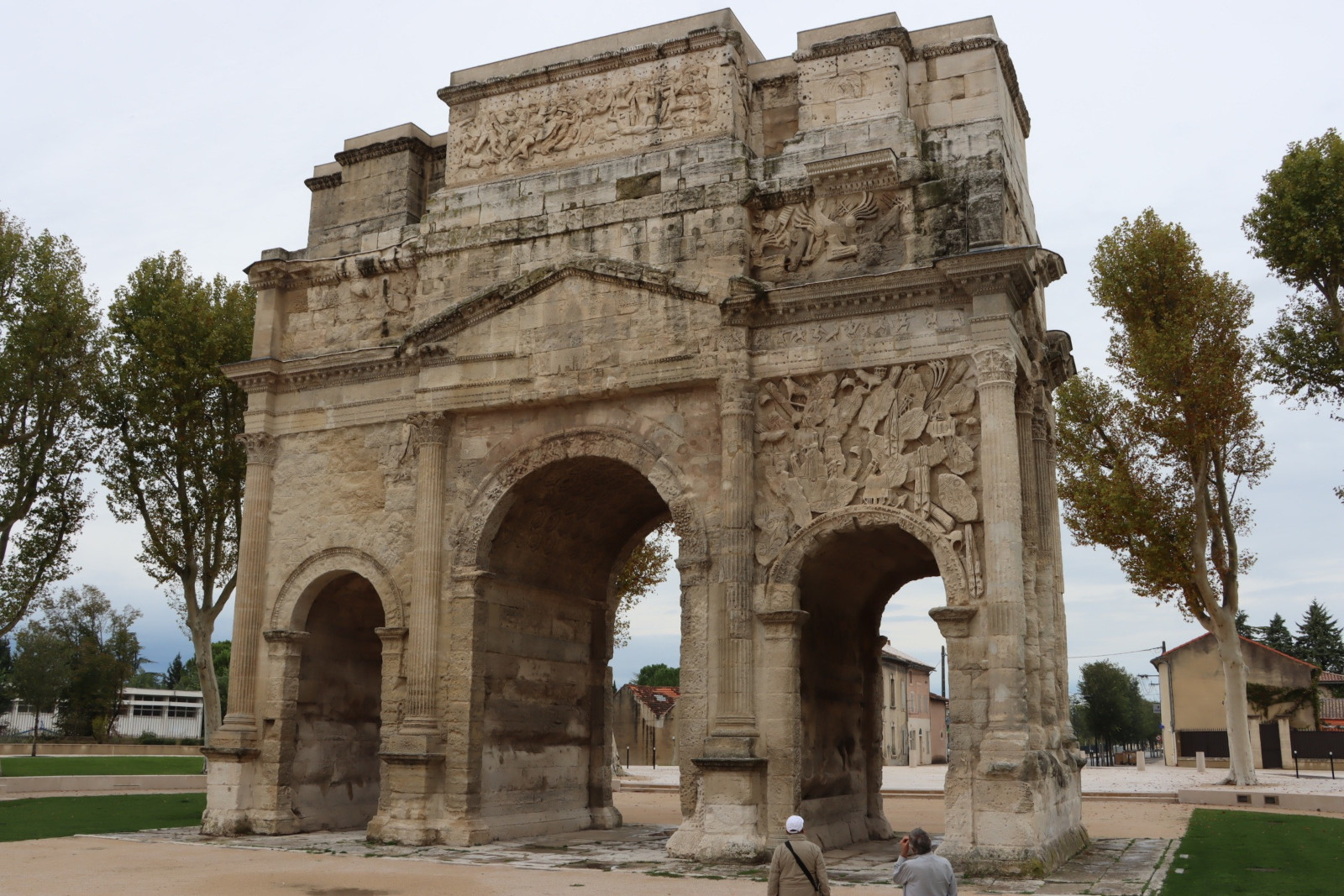 Au Ier siècle ap. J.-C., l’arc de triomphe servait de porte principale au nord de la cité, sur la Via Agrippa. Ses dimensions sont particulièrement monumentales : 19,21 m de haut, 19,57 m de large sur 8,40 m en profondeur. Il comporte trois portes, une pour les chars au centre et deux pour les piétons sur les côtés. Lors de la pompe triomphale, l’imperator (général victorieux) passait par la grande porte et le cortège par les portes latérales.