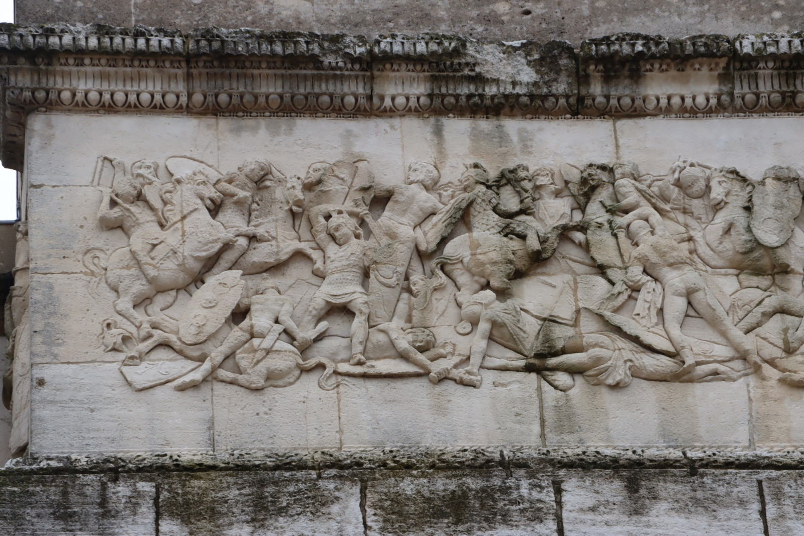 Dans la scène de bataille sculptée en bas-relief sur le second attique (façade nord), les Romains se distinguent par leur équipement des Gaulois, vus comme des "barbares" nus et chevelus. L’officier romain qui est représenté debout à gauche, casqué et cuirassé, brandissant son épée, tient dans sa main gauche son bouclier vu de profil : sur celui-ci on peut voir la figure du Capricorne, signe du zodiaque et symbole fétiche d’Auguste, pris comme emblème de la IIe légion Augusta.