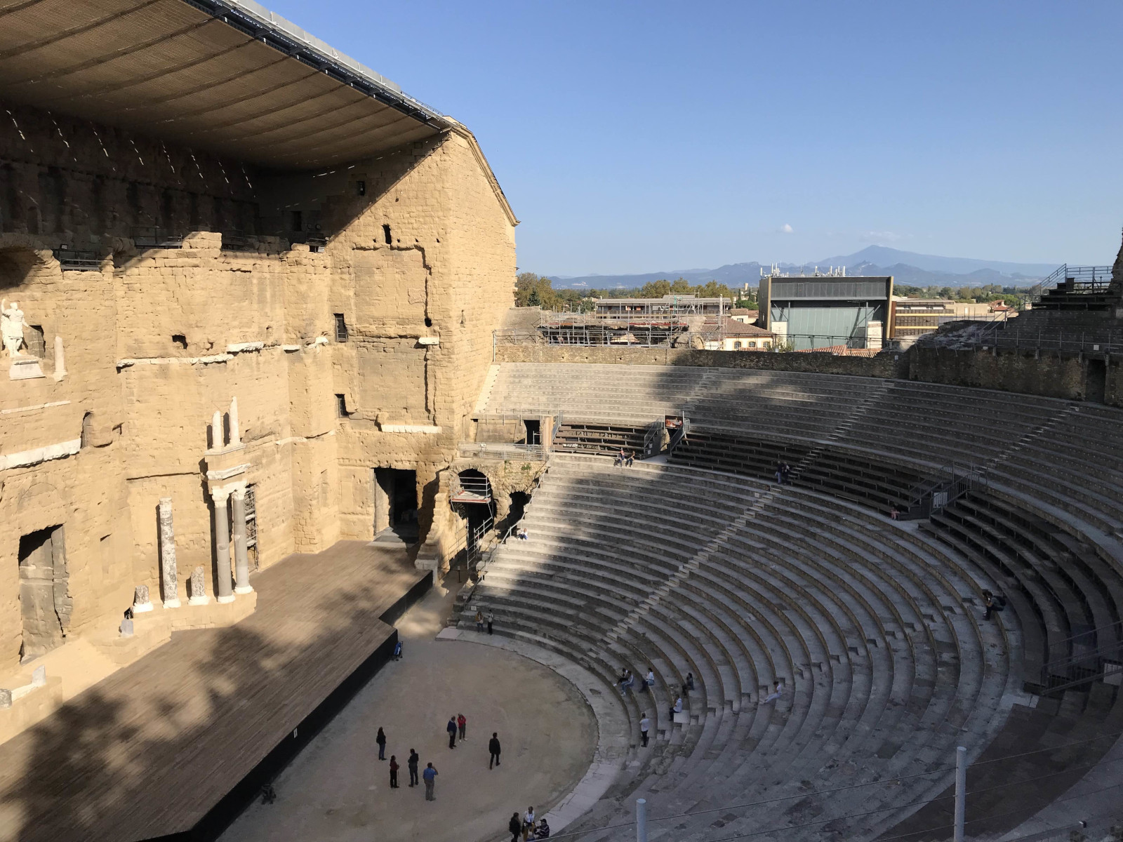 L’hémicycle de la cavea pouvait accueillir jusqu’à 10 000 spectateurs répartis selon leur rang social sur 34 gradins, organisés en 3 séries : la 1e, la plus basse (ima cavea), était réservée aux hommes importants de la cité (avec des sièges mobiles autour de l’orchestra pour les magistrats) ; dans la 2e, intermédiaire (media cavea), s’asseyaient les prêtres, les marchands, les citoyens romains et dans la 3e, la plus haute (summa cavea), les prostituées, les esclaves et tous les non-citoyens.