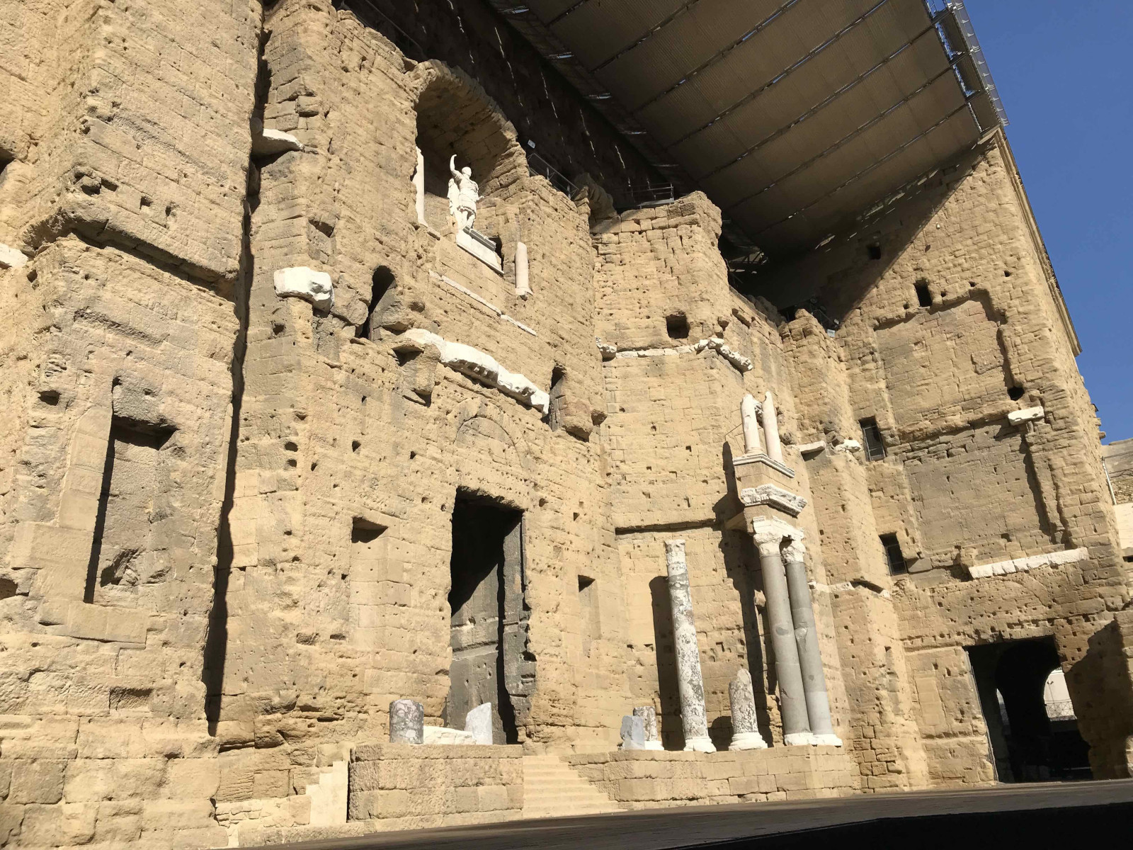 La niche centrale du mur de scène abrite une statue colossale (3,55 de haut) retrouvée en morceaux et restaurée en 1951 : elle représente l’empereur Auguste en général victorieux (imperator) saluant et tenant son bâton de commandement (la tête n’est pas d’origine). La scène a été couverte en 2006 d’un toit de verre rappelant le voile antique (velum) qui protégeait les spectateurs du soleil et de la pluie. Ce système se mettait en place grâce à des poutres fixées aux corbeaux couronnant les murs.