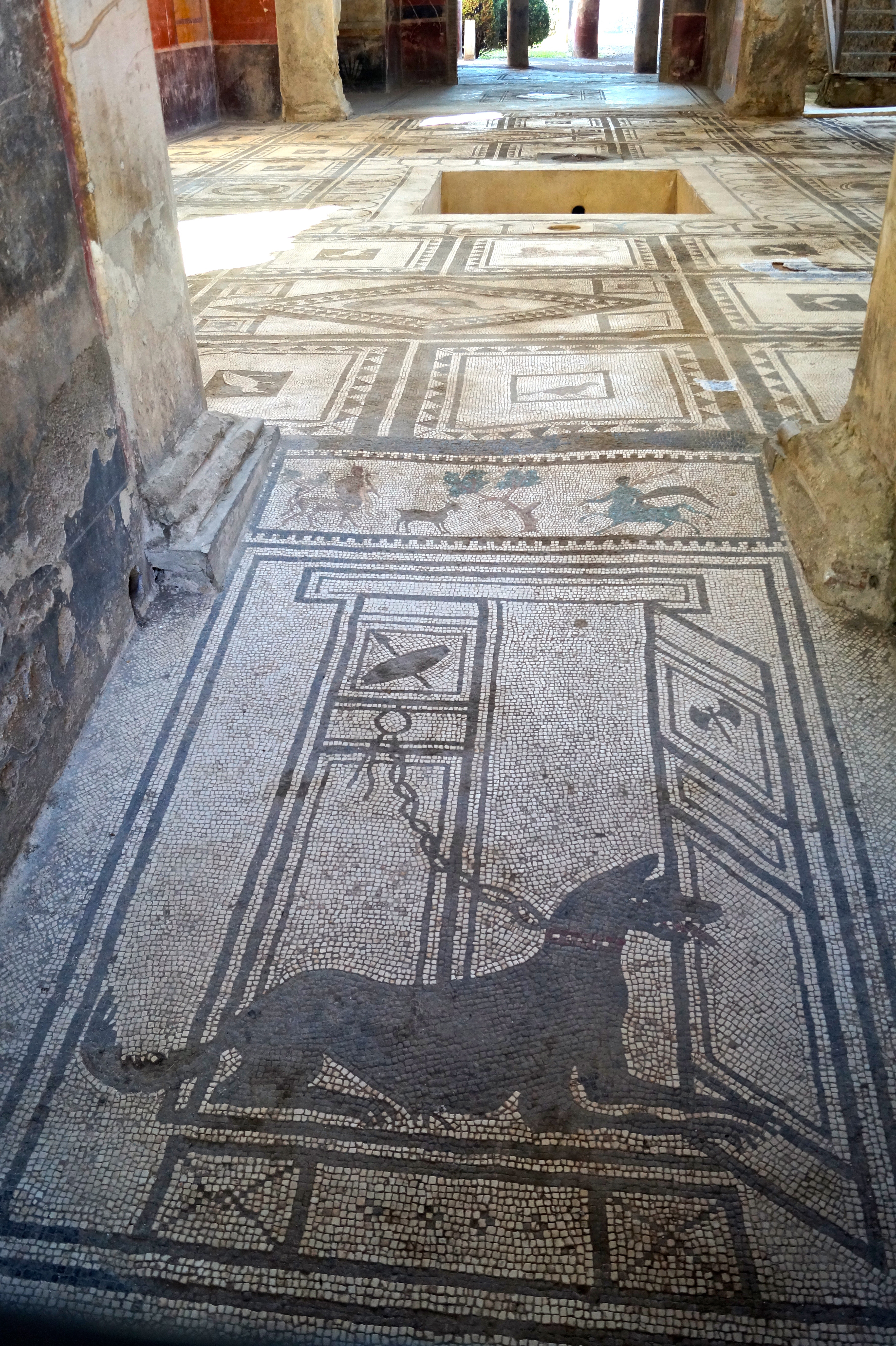 Les animaux sont très représentés sur les mosaïques de Pompéi. Les fouilles de la regio V qui ont permis d’ouvrir une rue entière (l’« allée des balcons ») ont inauguré deux remarquables demeures dont la maison de Jupiter. On y a retrouvé en 2018 deux mosaïques colorées associant formes humaines et animales. Le directeur des fouilles y a identifié le mythe d’Orion. L’interprétation de ces mosaïques reste mystérieuse et plusieurs indices pourraient évoquer plutôt une influence égyptienne.