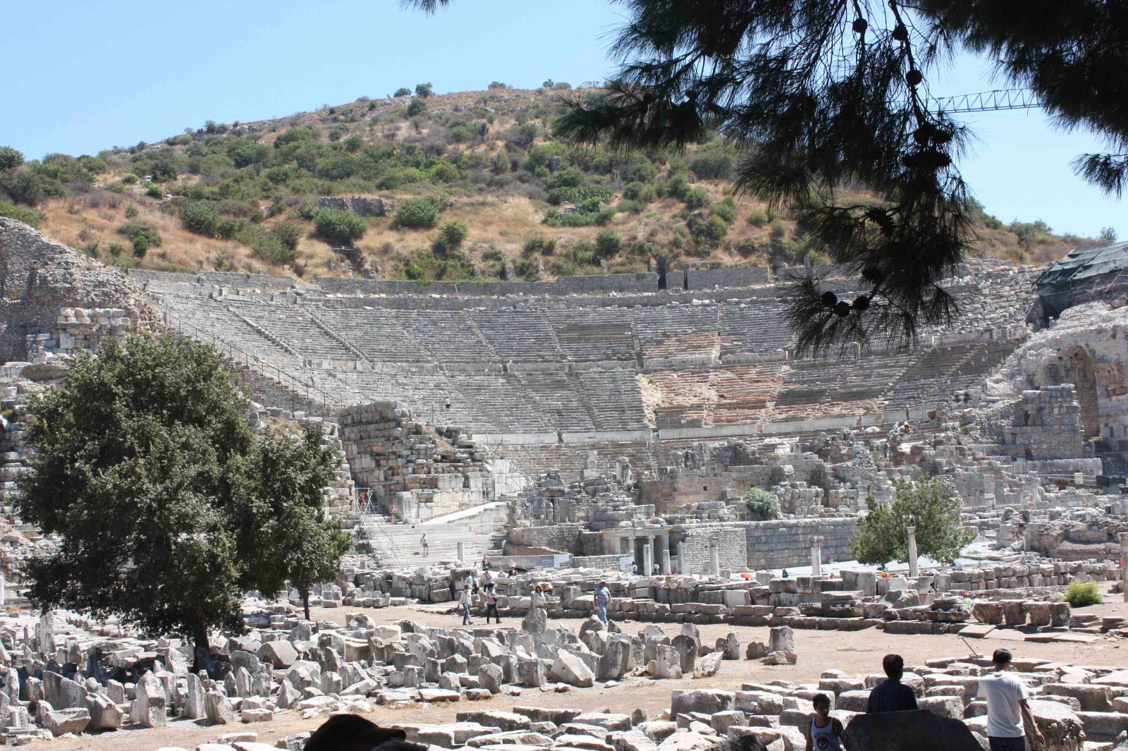 Le grand théâtre a été construit dans le flanc Ouest du mont Peion, face au port, à l’époque hellénistique (vers 270 avant J.-C.). Agrandi à plusieurs reprises à l’époque romaine, il était l’un des plus vastes théâtres du monde antique, sinon le plus vaste. Il pouvait accueillir environ 24 000 personnes, soit un dixième de la population d’Éphèse. Pendant la période romaine, il fut aussi utilisé pour des combats de gladiateurs.