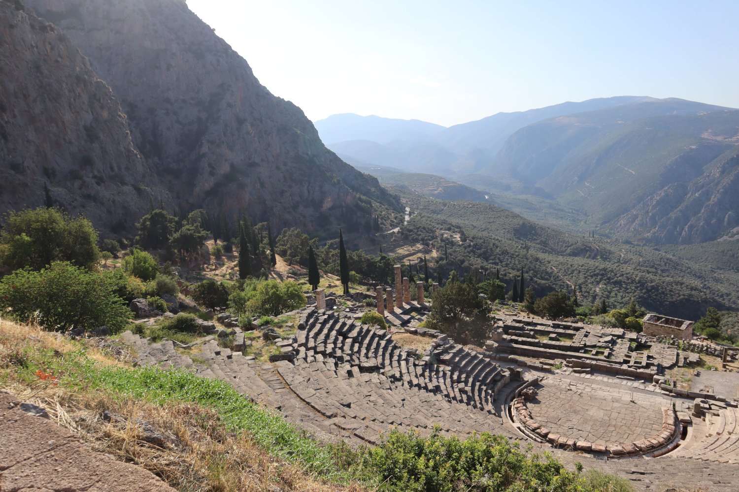 Situé en Phocide, région de Grèce centrale, non loin de la mer Ionienne, Delphes était pour les Grecs le centre géographique du monde. À près de 600 mètres d’altitude, accroché au flanc du Mont Parnasse, ce site a abrité de la fin du VIIe siècle au IVe siècle après J.-C le plus prestigieux sanctuaire d’Apollon où l’on venait pour consulter l’oracle de la Pythie. En contrebas, au loin, se trouvaient le gymnase et le sanctuaire d’Athéna Pronaia.