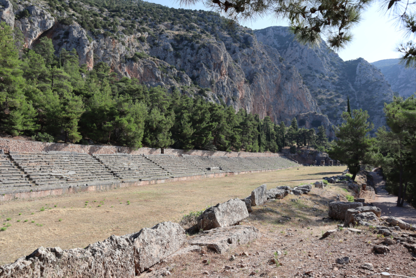 Tout en haut du site, au cœur d’un bois de pins, s’étend avec une piste de 178 mètres le stade construit au IIIe siècle avant J.-C. et remanié par les Romains. Les Jeux Pythiques comportaient des épreuves sportives (course simple et longue, lutte, boxe, pancrace et pentathle). Les athlètes entraient dans le stade en passant sous un arc de triomphe romain. Les vainqueurs recevaient une couronne de laurier. Hérode Atticus remplaça les gradins de terre par des gradins en pierre.