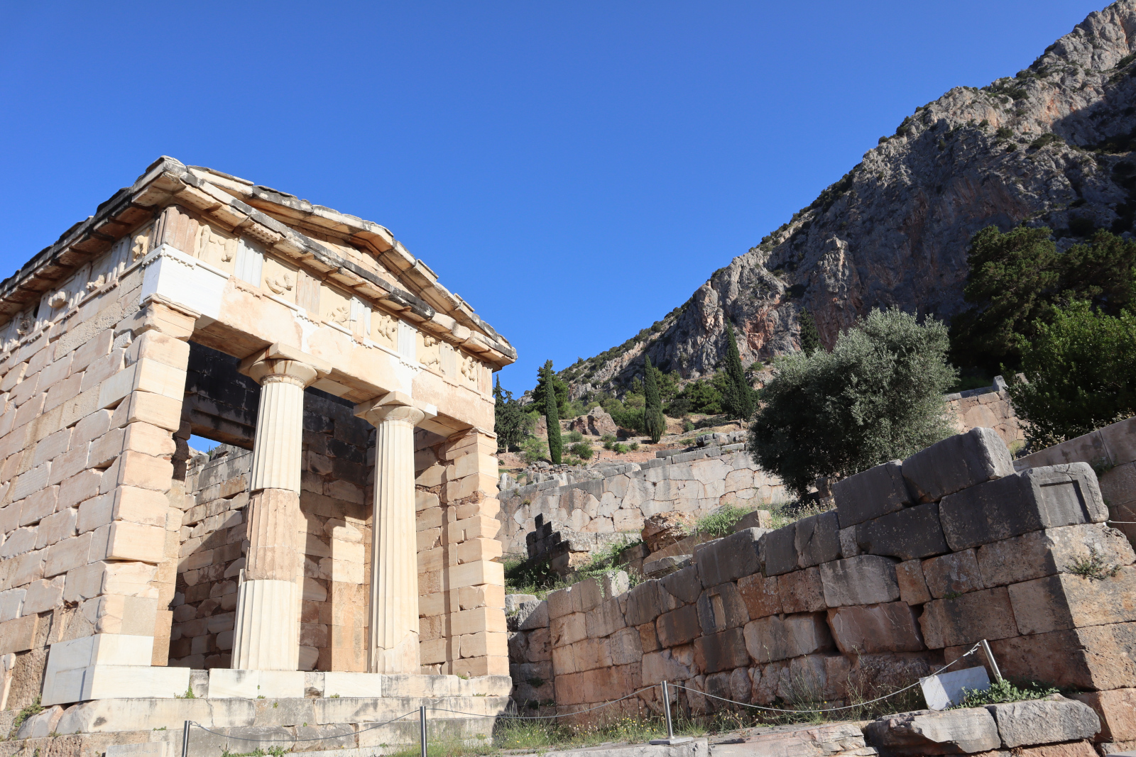 De nombreuses inscriptions sont gravées sur le mur Sud du monument. On y a retrouvé parmi des décrets honorifiques en faveur d’Athéniens, un précieux témoignage sur la musique antique avec cet hymne à Apollon : « Écoutez, vous à qui l’Hélicon aux bois profonds échut en partage, filles, aux beaux bras, de Zeus retentissant ! Accourez pour charmer de vos accents votre frère Phébus à la chevelure d’or. »