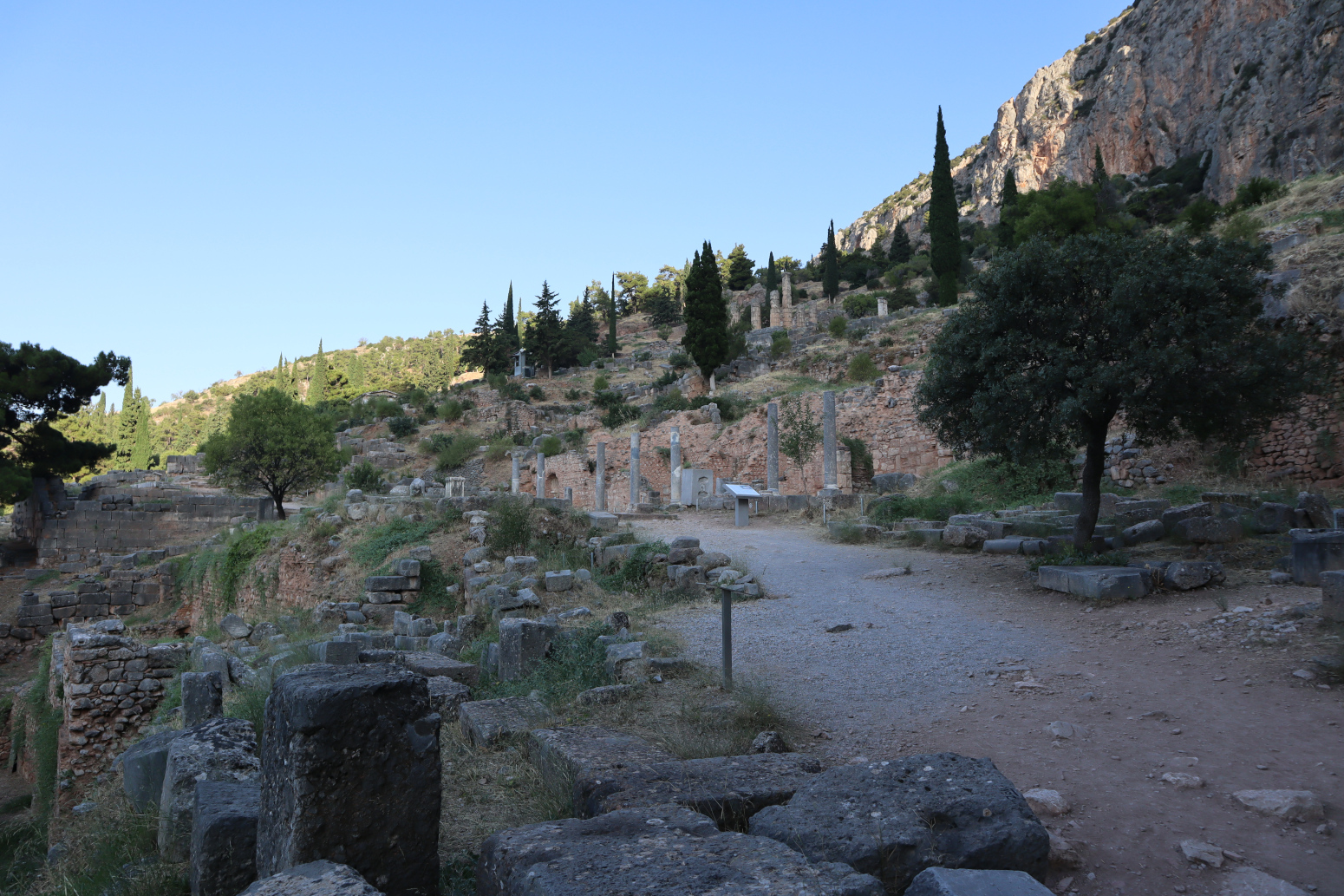Le nom de Delphes viendrait de la métamorphose d’Apollon en dauphin (δελφίς, delphís) : le dieu aurait pris l’apparence de cet animal pour attirer des marins crétois afin de les charger d’instaurer son culte sur le site. Après s’être purifiés à la fontaine Castalie, les pèlerins apportaient un pelanos (tribut) et pouvaient acheter un ex-voto (offrande de remerciement) avant de s’engager dans la Voie Sacrée qui chemine vers le temple d’Apollon.