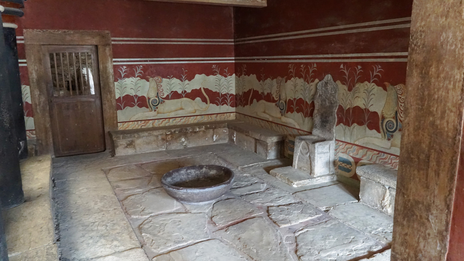 Dans l’aile Ouest du palais, sir Evans avait identifié ce lieu comme la salle du trône de Minos, en raison de son siège à dossier et des bancs qui l’encadrent. Or, cette pièce sans fenêtres et décorée d’une fresque murale représentant des griffons serait plutôt la salle principale d’un sanctuaire. Reconstruite par les Mycéniens vers 1470 avant J.-C., elle s’apparente au mégaron (pièce principale dotée d’un foyer central entouré de quatre colonnes). Un bassin lustral est posé au centre.