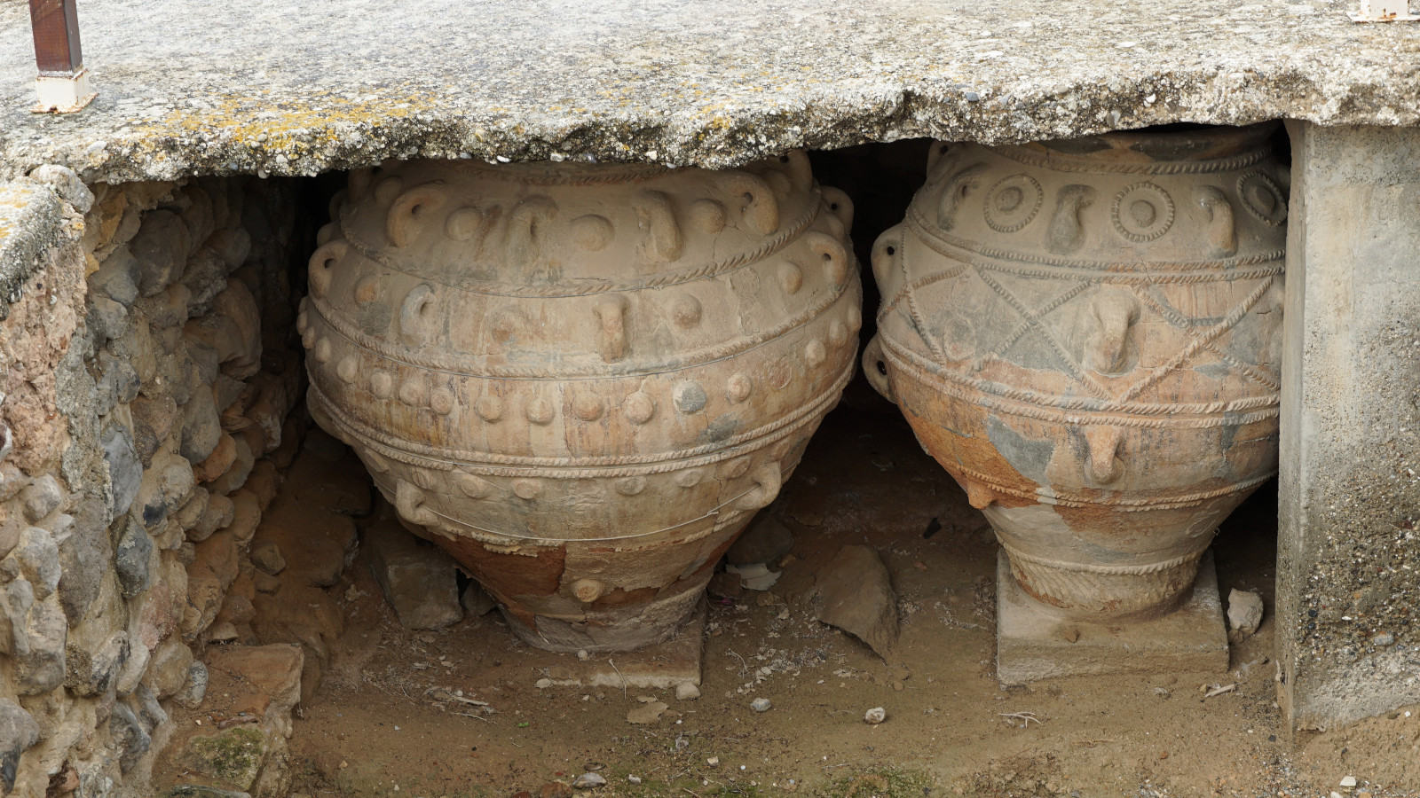 Sans doute dès l’époque minoenne, les productions des riches terres agricoles environnantes étaient collectées, enregistrées sur des tablettes puis stockées dans les palais. On parle d’économie palatiale. En témoigne le grand nombre de magasins et d’espaces de stockage renfermant des pithoi (grandes jarres intransportables lorsqu’elles sont pleines) retrouvés à Phaistos. Décorés de formes géométriques, ils pouvaient contenir de l’huile, du vin ou tout autre aliment de base.