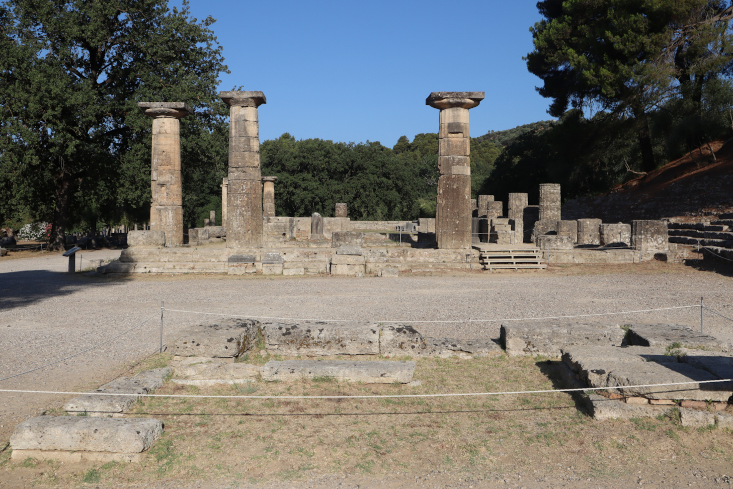 Le temple d’Héra est périptère hexastyle avec seize colonnes sur les côtés. À l’origine, elles étaient en bois. Tous les cinq ans, seize femmes réalisaient un voile pour la déesse. Elles étaient aussi chargées d’organiser les jeux en son honneur, les Héraia, courses réservées aux femmes. Au premier plan, subsistent les vestiges de l’autel consacré à Héra. C’est là que l’on rallume la flamme olympique lors de cérémonies modernes.