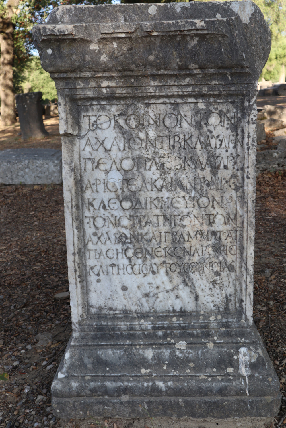 « Le Koïnon des Achéens (a érigé la statue de)Tib(erius) Claudius Pelops ». Un « koïnon » est un Etat fédéral réunissant plusieurs cités ou peuples pour se défendre contre un voisin puissant. D’abord démantelées par Rome, les « koïna »renaissent à la fin du Ier et au IIe s. ap. J.-C sous l’impulsion des empereurs romains comme le prouve cette inscription. Tiberius Claudius porte un prénom et un nom romains, mais le troisième reste grec, car il a obtenu des Romains le droit de cité au Ier s.