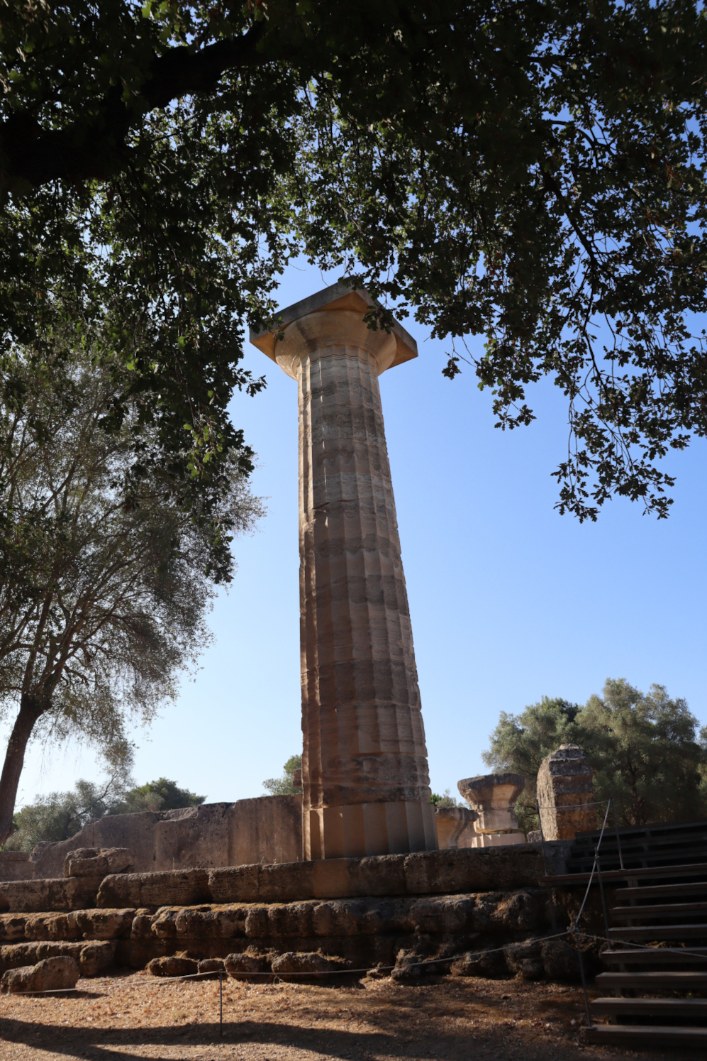 Le temple a été détruit par des tremblements de terre et des inondations. Seule une colonne dorique a été restaurée. Outre la statue colossale qu’il renfermait, le temple était richement décoré. Le fronton est, présidé par Zeus, représentait la première course de chars à Olympie, gagnée par Pélops. Le fronton ouest sous le regard d’Apollon décrivait le combat des Lapithes et des Centaures tandis que les travaux d’Hercule ornaient les métopes à l’entrée de la cella.