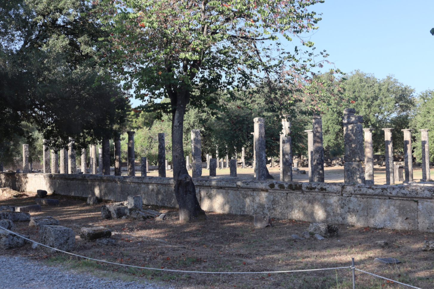 Bordée d’un portique à colonnes doriques, la palestre comporte une cour centrale. Elle était réservée aux exercices gymniques de la lutte, du pugilat et du saut. Elle était munie au nord d’un dallage spécial en briques striées pour empêcher les pieds nus des pugilistes et des sauteurs de glisser. Les portiques du gymnase et de la palestre étaient ornés de statues.