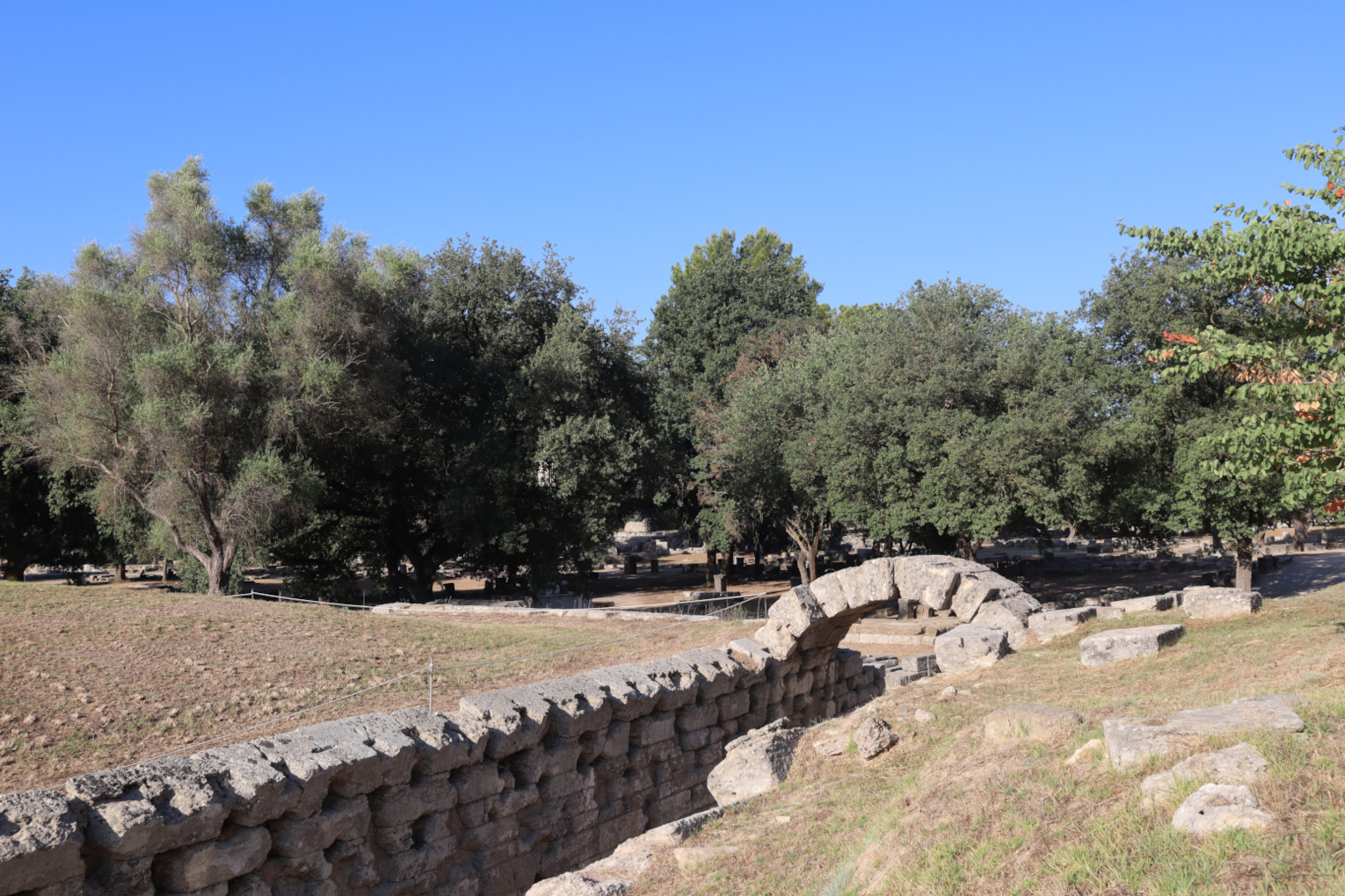 Pour entrer dans le stade, les athlètes et les membres du jury empruntaient ce couloir. Long de 32 m., il a été transformé en tunnel voûté au Ier s. ap. J.-C. Il marque le lien entre le stade et le sanctuaire, c'est-à-dire le lien étroit entre les Jeux Olympiques et le culte des dieux. Lors de fouilles, on a distingué cinq époques dans l’aménagement du stade qui pouvait contenir plus de 20000 spectateurs.