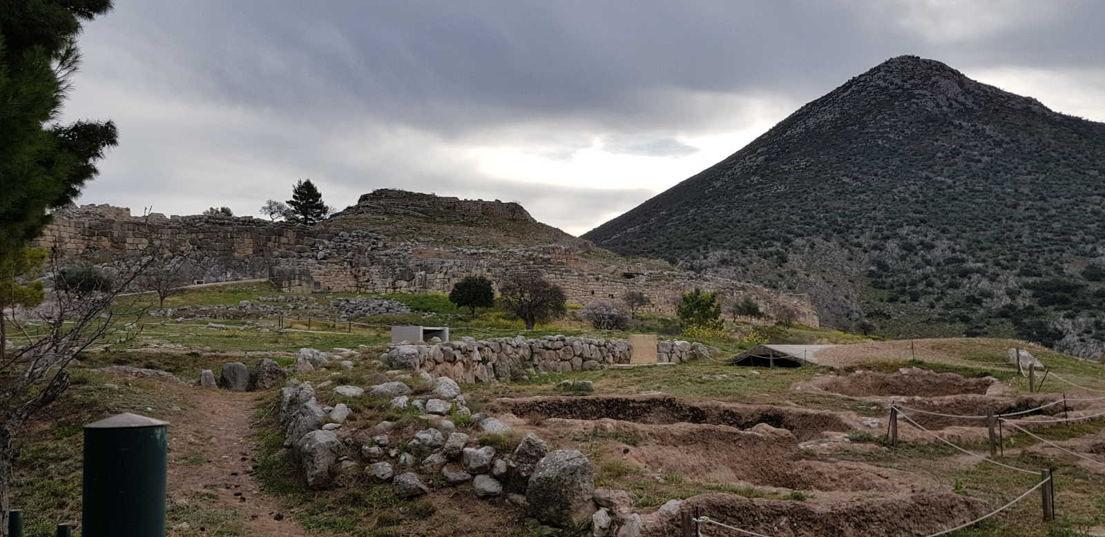 Encadrée de sommets coniques, Mycènes est une acropole d’environ 30 000 m2 et de forme triangulaire. À l’extérieur des murailles, sur les collines situées à l’ouest et au nord-ouest, se trouvaient également des maisons privées et des tombes. La citadelle, connue pour avoir été la cité des Atrides et du roi Agamemnon, culmine à 378 mètres. Les montagnes protègent l’acropole isolée par des ravins.