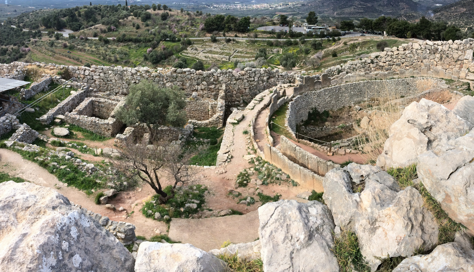 Dans le prolongement du cercle de tombes subsistent les vestiges de maisons telles la maison du Vase aux Guerriers et la maison Tsountas (du nom d’un archéologue). Occupées jusqu’à l’invasion dorienne, elles ont été rebâties plusieurs fois. Certaines comportaient un étage. On pense que plusieurs pièces servaient de sanctuaires, si l’on se réfère au sujet religieux des objets retrouvés, notamment des idoles en terre cuite.
