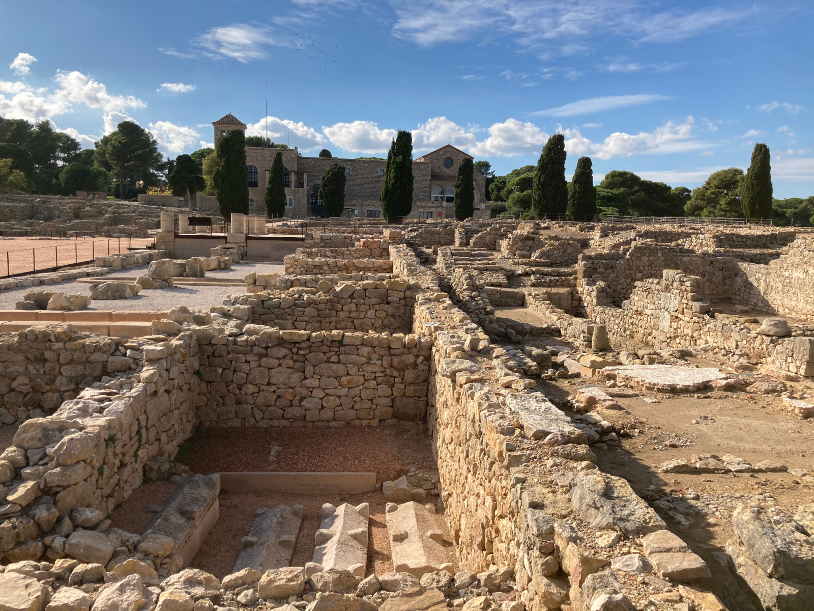 Emporiae concentre le plus grand nombre de mosaïques connues dans une ville romaine. La plupart proviennent de grandes maisons romaines. La Domus des mosaïques est l'un des ensembles les plus remarquables du site. Dès les premières phases de construction au Ier siècle avant J.-C., son sol est orné de pavements en céramiques décorés de tesselles blancs et noirs et de fragments de cuivre, tels ceux conservés dans certaines pièces latérales de l'atrium ou l'accès au jardin.