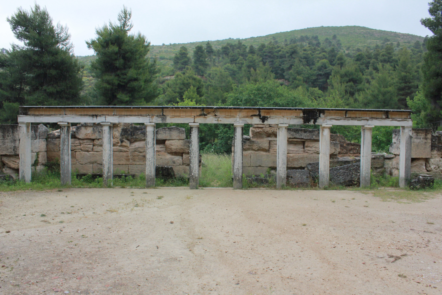 La colonnade du proscénium est longue de plus de 12 mètres. Ses colonnes doriques ont été restaurées. Dans les entrecolonnements étaient accrochés des panneaux peints qui servaient de décor. En contrebas du théâtre et du portique d’incubation se trouvait un stade pour les épreuves athlétiques et hippiques des Mésallia Amphiareia.