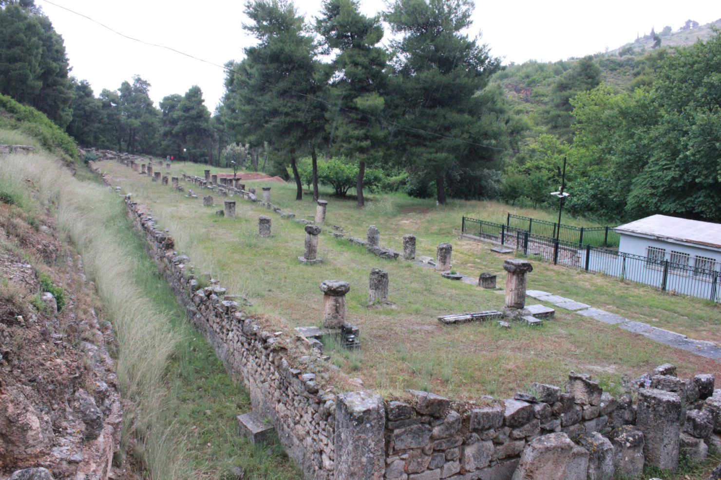 Le pèlerin pénétrait dans le sanctuaire par l’Est et était invité à se purifier dans des bassins. Il pouvait ensuite être orienté vers des lits installés dans la stoa. Puis les prêtres venaient interpréter les rêves du malade dans lesquels Amphiarios apparaissait pour donner le remède. L e portique soutenu par des colonnes doriques et ioniques mesure 11 × 110 mètres. Des bancs en marbre étaient installés le long des murs.