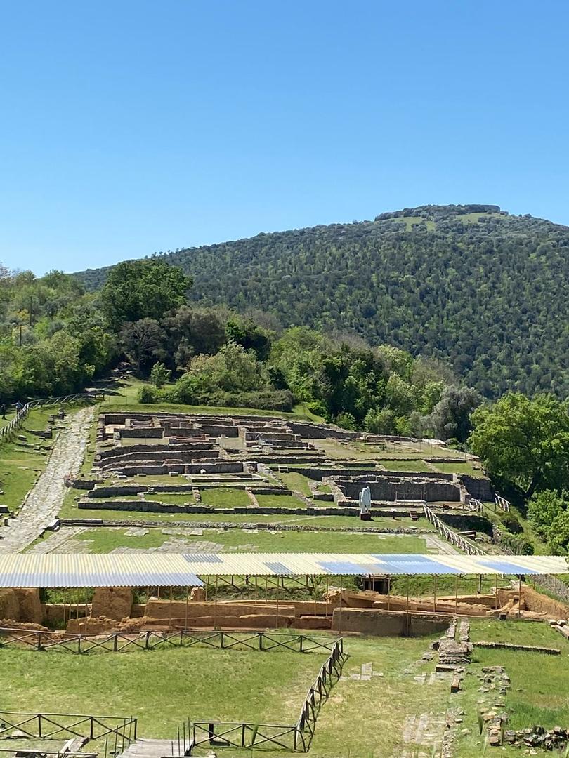 Dans la partie Sud de la cité se trouvait le siège des Flamines chargés du culte impérial de la dynastie julio-claudienne. Les murs de l’édifice rectangulaire étaient recouverts de dalles de marbre. Des niches abritaient des statues, dont l’une est reconstituée. Au premier plan, des fouilles archéologiques récentes ont excavé des maisons étrusques.