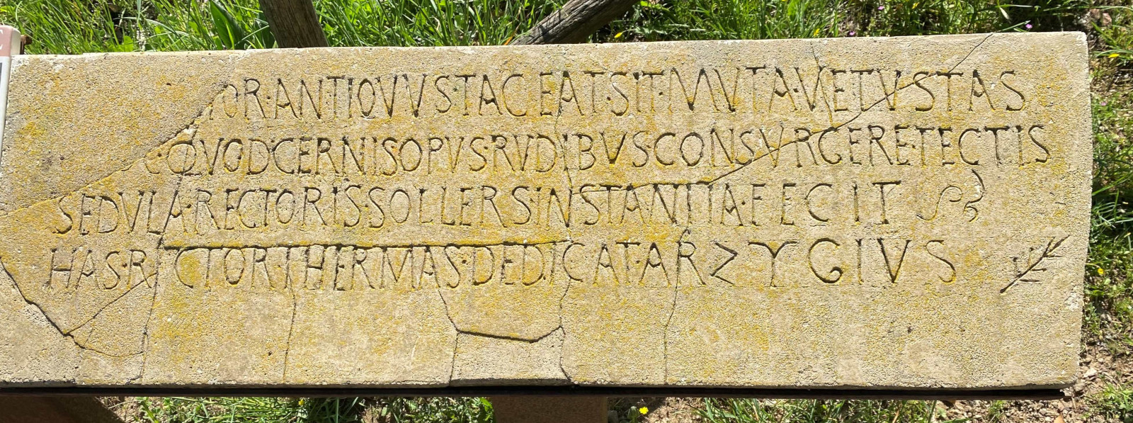 Cette inscription en langue latine a donné son nom à de petits thermes à l’extérieur de la cité. La dédicace honore Betitius Perpetuus Arzygius, gouverneur après 366 et qui a restauré l’édifice thermal. Au contraire du latin, la langue étrusque n’était pas d’origine indo-européenne, mais elle a emprunté aux Grecs les caractères de leur alphabet. Hormis quelques lettrés, les Romains ne la comprenaient plus dès le Ier siècle après J.-C.