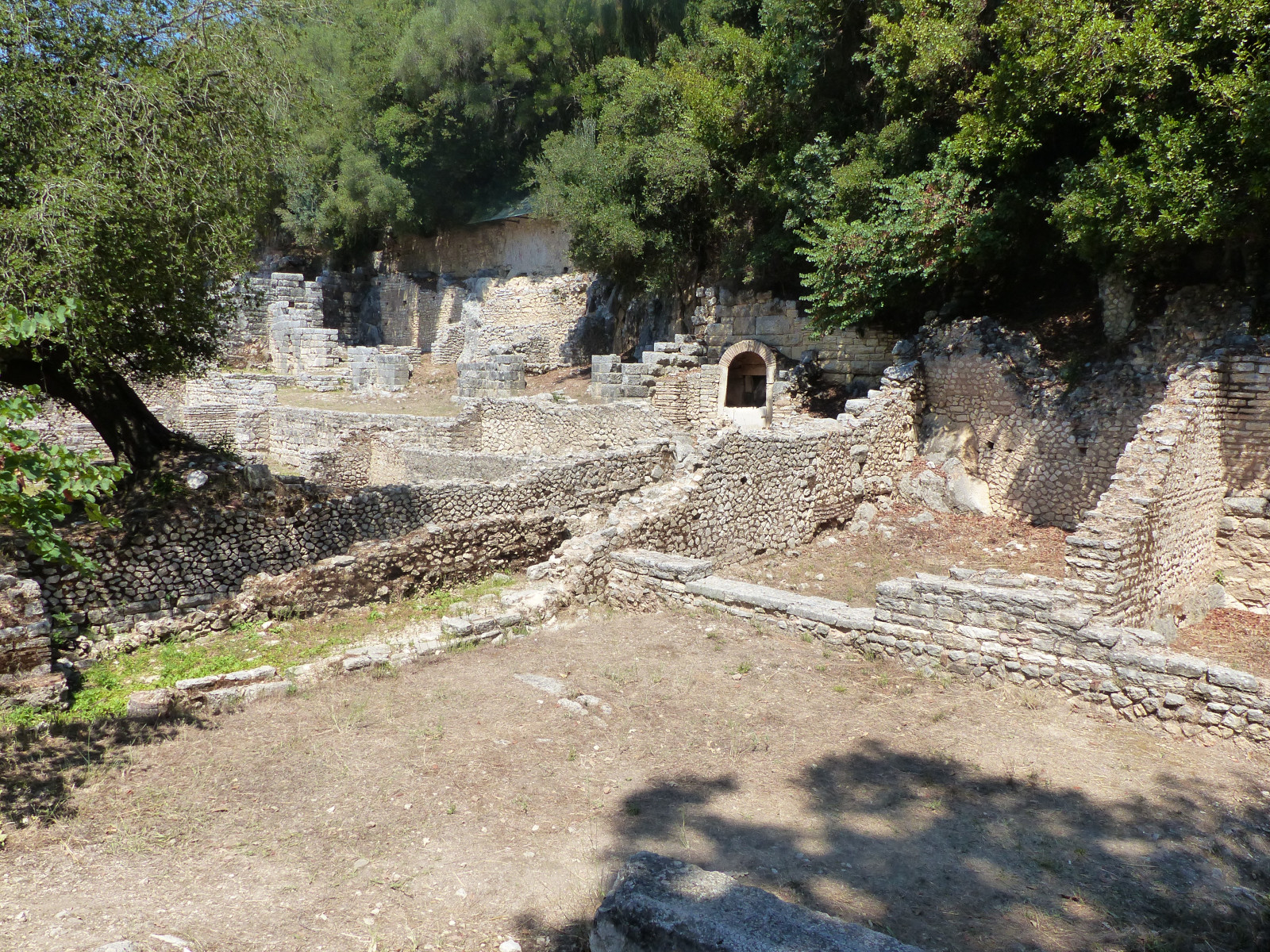 À côté du portique couvert de la stoa se trouve un puits sacré où les pèlerins se purifiaient avant les cérémonies religieuses. À droite, donnant sur le forum qui recouvre l’ancienne agora grecque, se dressent les vestiges de trois salles d’un temple romain avec une exèdre, salle semi-circulaire destinée aux réunions. Il était sans doute dédié à Minerve.