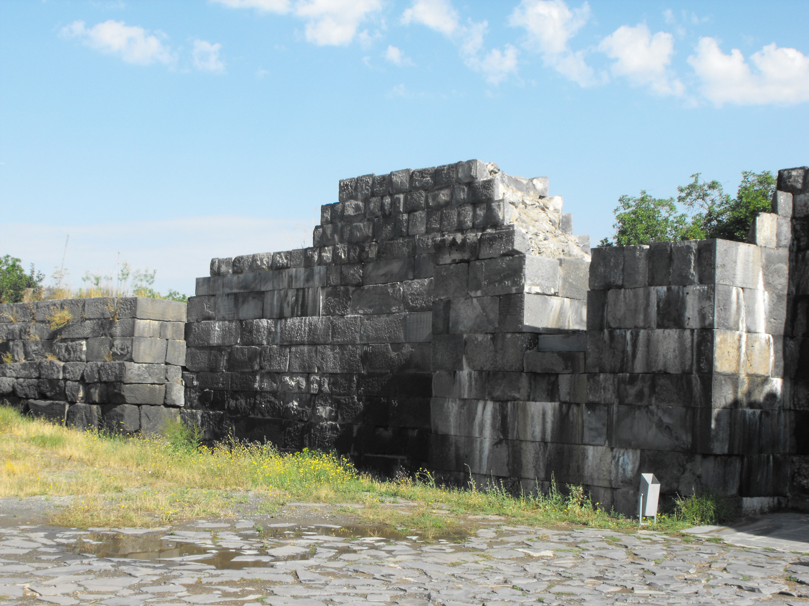 La forteresse était protégée par un rempart muni de 14 tours rectangulaires crénelées construites en gros blocs de basalte local bleuté sans mortier. La muraille de 2 mètres d’épaisseur pouvait s’élever jusqu’à 12 mètres, évoquant les murs dits « cyclopéens ». Tacite (Annales, 12, 45) raconte que Mithridate, placé sur le trône d’Arménie (roi de 35 à 37 puis de 42 à 51 après J.-C.) et victime d’un complot, se réfugia en 51 après J.-C. à Gorneae (Garni). L’enceinte a été remaniée au cours des siècles.