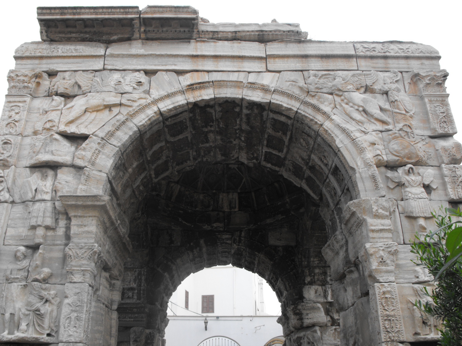 Deux frontons sont ornés de bas-reliefs représentant le dieu et la déesse tutélaires de la ville : Apollon et Minerve. On reconnaît la déesse emportée par un char traîné par des sphinx, mais aussi des biges attelés par des griffons qui emportent dans une apothéose Marc Aurèle. L’arc de triomphe en diffusant un modèle architectural et politique auprès des provinces conquises constitue un symbole de l’impérialisme romain.