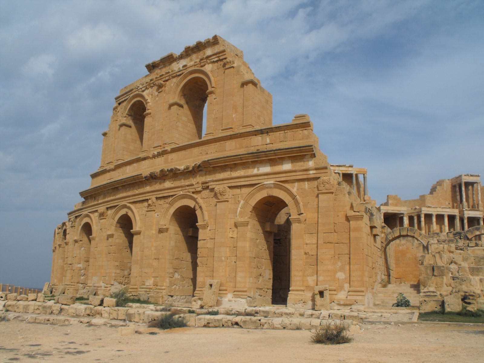 Sabratha, fondée au IVe siècle avant J.-C. par les Phéniciens, devient colonie romaine en 157 après J.-C. C’était, avec Oea et Leptis Magna l’une des trois grandes cités de la Tripolitaine. À l’Est de la cité, le théâtre est aujourd’hui l’élément phare du site antique car c’est le plus grand d’Afrique romaine et celui dont le mur de scène est le mieux conservé. À l’extérieur, il était constitué de trois étages d’arcades. Le rez-de-chaussée était percé de 25 entrées permettant d’accéder aux gradins.