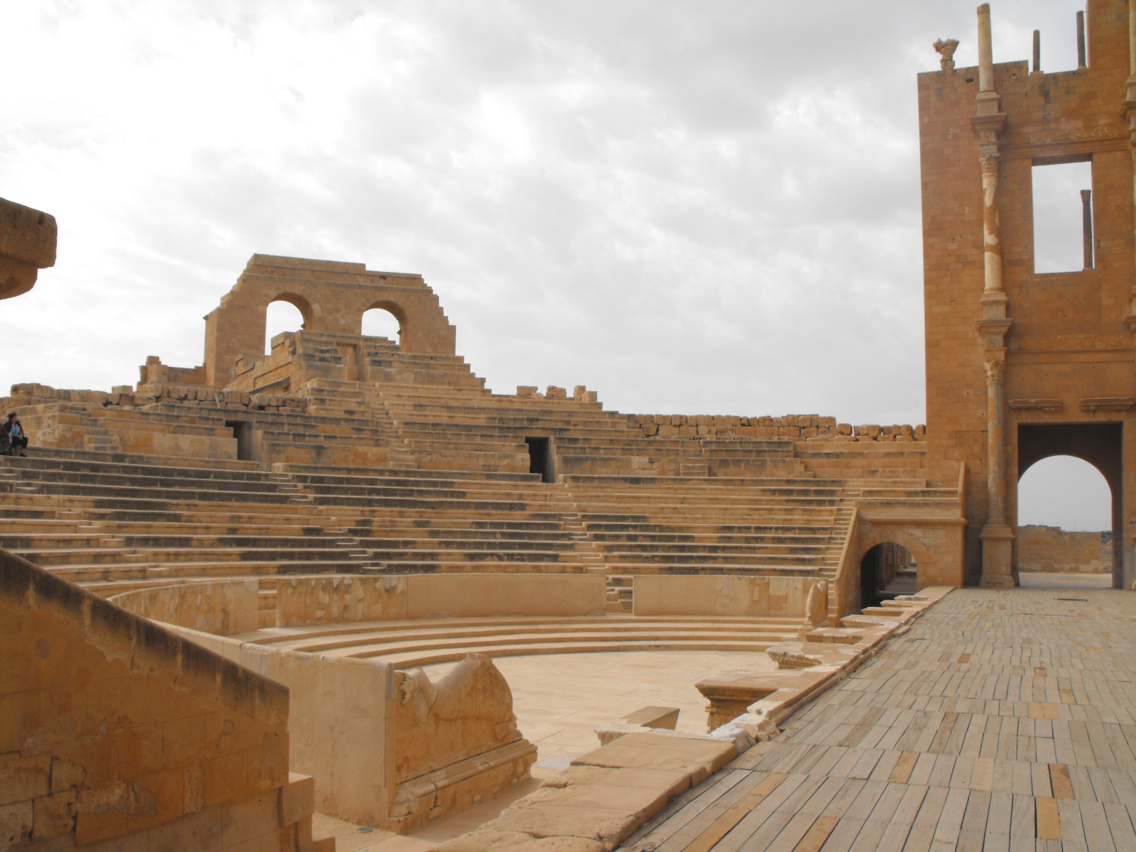 La cavea pouvait contenir 5 000 spectateurs répartis sur trois niveaux de gradins dont deux seulement subsistent. Le public y accédait par des vomitoires avant d’emprunter les escaliers. Entre la scène et la cavea, l’orchestra proposait quatre gradins de places réservées aux notables. Cet espace central semi-circulaire, bordé d’une balustrade (balteus) et fermé par des sculptures de dauphins était accessible grâce à un couloir latéral.