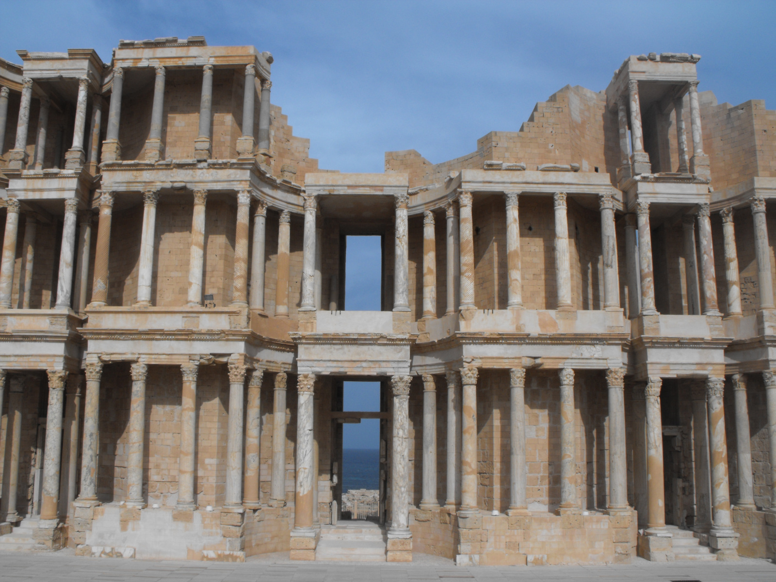 Le théâtre, construit vers la fin du IIe siècle après J.-C. à même le sol selon le plan type des théâtres romains décrit par Vitruve, est disposé de manière à ce que les spectateurs aient la mer pour toile de fond derrière le mur de scène. Percé traditionnellement de trois portes, ce frons scaenae monumental et unique, haut de plus de 22 mètres, a été reconstitué par anastylose. Il compte 96 colonnes corinthiennes toutes différentes, sculptées dans des marbres de différentes provenances et couleurs.