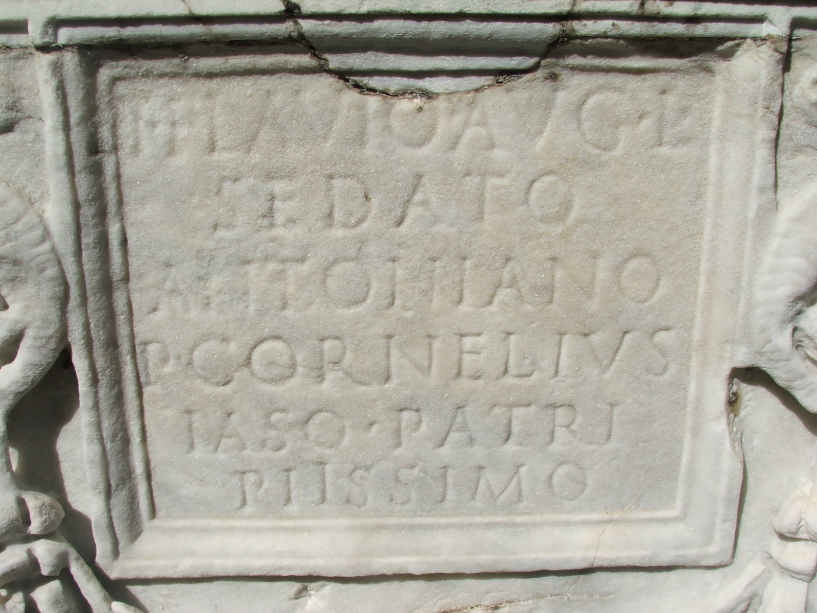Sur la terrasse Ouest se trouve un autel funéraire romain en marbre datant des Ier-IIe siècles après. J.-C. Il a été découvert au XVIe siècle et porte une inscription (CIL 6, 18203) funéraire en hommage « à Titus Flavius Sedatus Antonianus, affranchi impérial », et offert par son fils « Publius Cornelius Iaso à son père très pieux ». On observe dans cette inscription un superlatif de l'adjectif « pius » sous la forme « piissimus », critiquée par Cicéron.