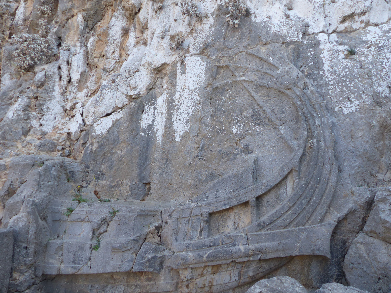 Pour célébrer une victoire navale des Rhodiens en 180 avant J.-C, le fils de Pythorikos (artiste probable de la Victoire de Samothrace) a sculpté la poupe d’une τριηρημιολία (trièrèmiolia) « navire de guerre long et sans pont à deux rangs et demi de rames ». On distingue l’aplustre en éventail, le gouvernail latéral et le siège du pilote, décoré en aile d’oiseau. Le pont, saillant d’un mètre, servait de base à la statue Hagésandros, fils de Mikion et peut-être prêtre de Poséidon.