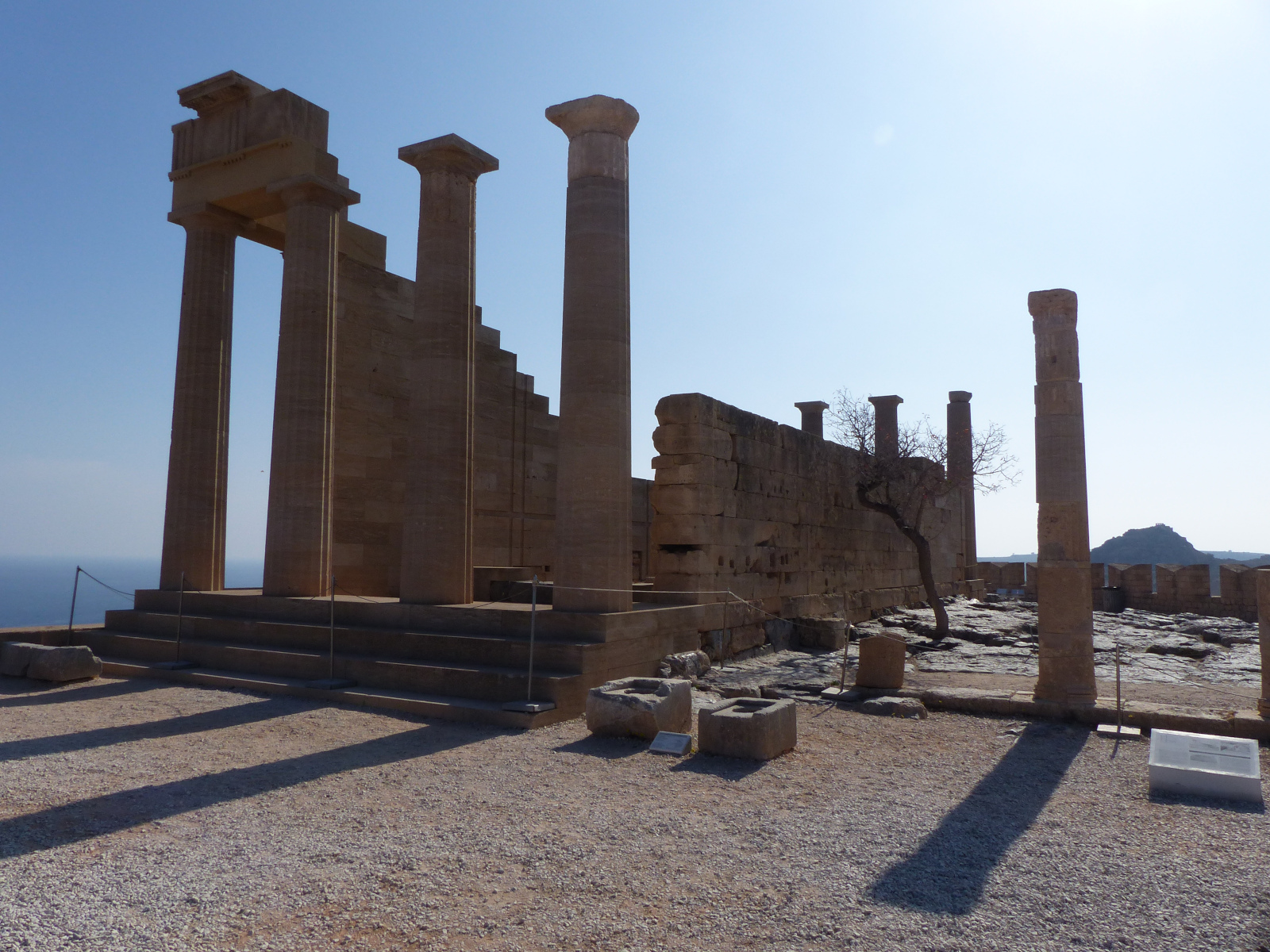 Sans doute construit par le tyran Cléobule au VIe siècle avant J.-C., sur la partie la plus haute de l’acropole, le temple dorique d’environ 8 par 22 mètres est reconstruit au IVe siècle avant J.-C., après un incendie destructeur. Une grande partie de la paroi Ouest du temple a été conservée. Les murs conservent des traces de fixation du revêtement intérieur. À droite de l’édifice, on a relevé quelques colonnes de la stoa d’un temple dédié à Psithyros et jouxtant le temple d’Athéna au IIe siècle après J.-C.