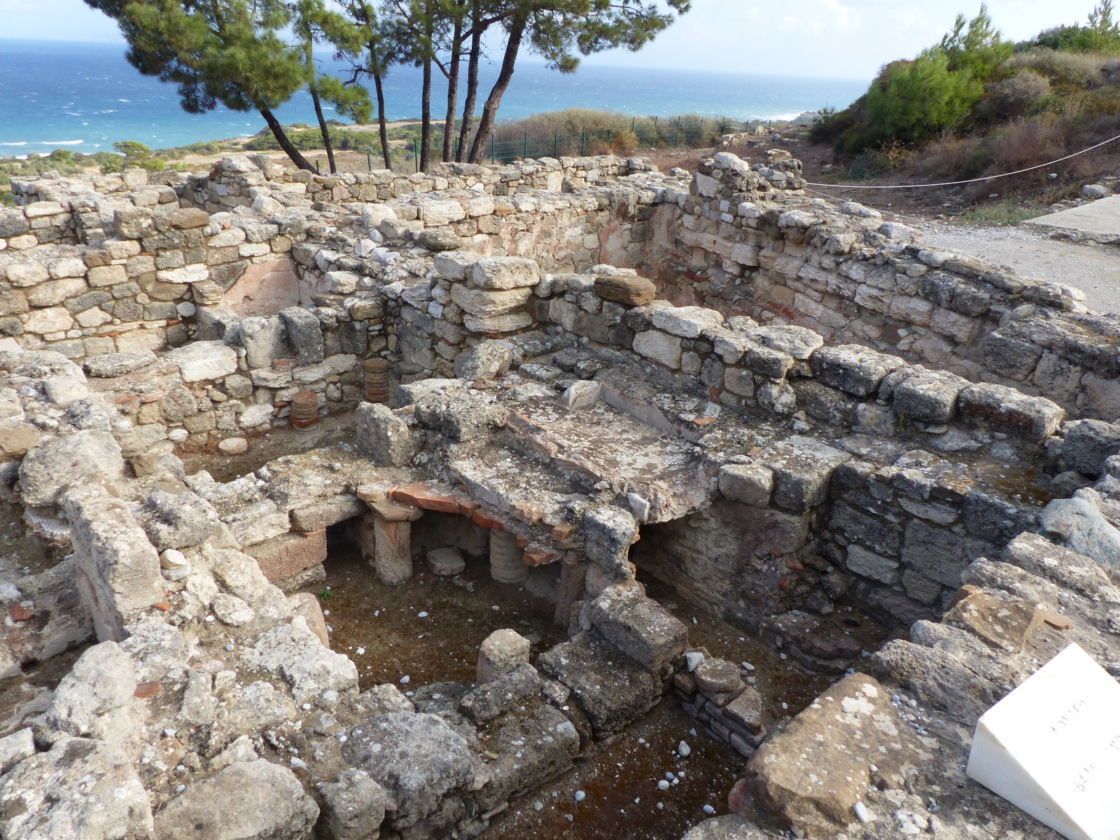 Dans la partie basse de Camiros se trouvent les vestiges de thermes publics caractéristiques des cités romanisées. Ce n’étaient pas les plus imposants de la cité, mais ce sont les mieux conservés. On peut encore y observer leur système souterrain de chauffage de l’eau appelé « hypocauste ». Le plancher surélevé par des pilettes (petites piles) offrait l’espace nécessaire aux canalisations.