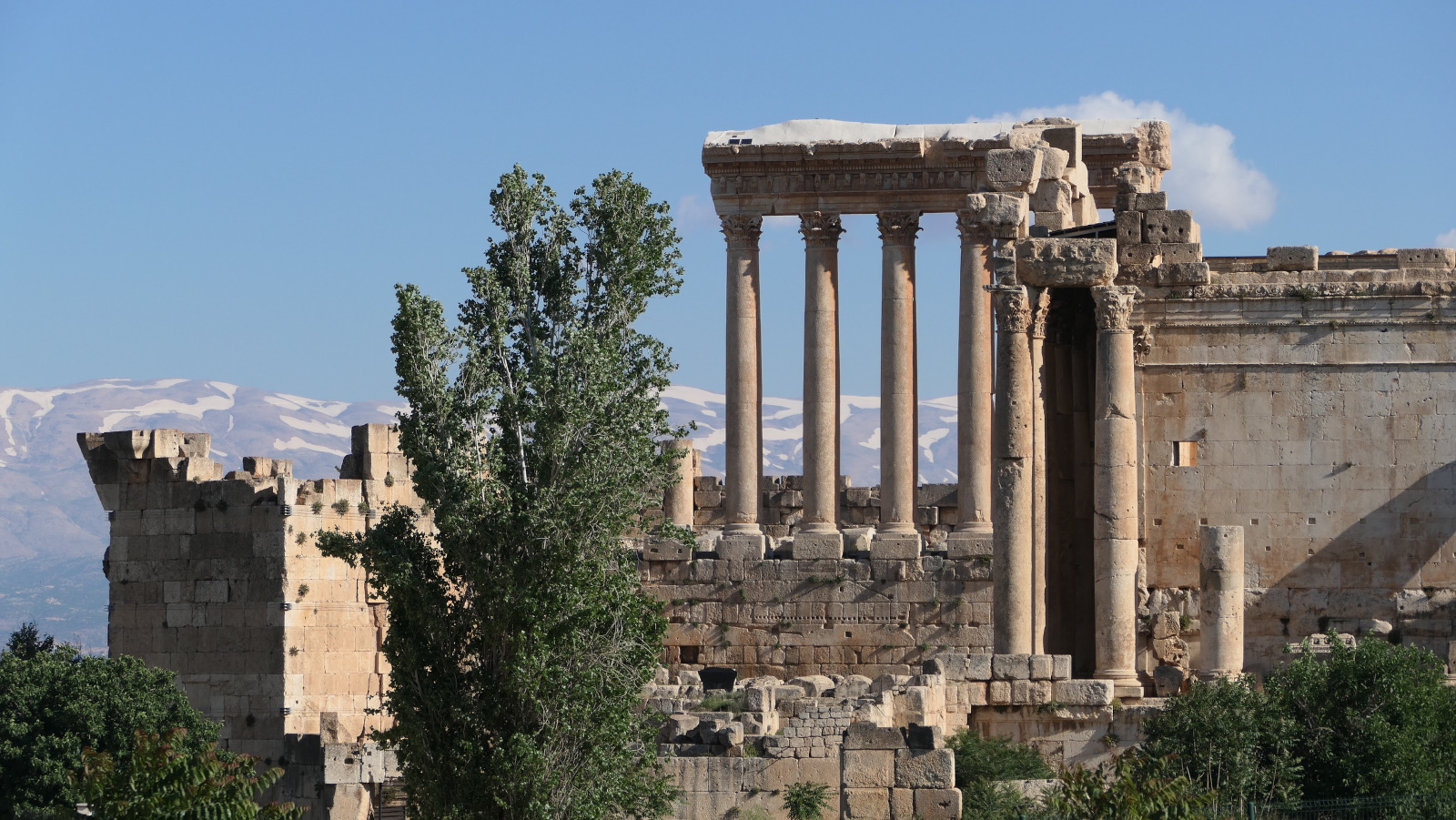 Le sanctuaire antique, inscrit au patrimoine mondial de l’UNESCO, forme un vaste plateau clos par une enceinte, la Qalaa, suivant le modèle des lieux de culte orientaux. On y honorait trois divinités orientales : Hadad, dieu de la foudre et des pluies, aux côtés de sa parèdre, Atargatis, déesse de la fécondité et Adonis, dieu de la végétation. Les Romains renomment cette triade héliopolitaine : Jupiter, Vénus et Mercure, puis Bacchus. Au Moyen-Âge, le sanctuaire est transformé en citadelle.