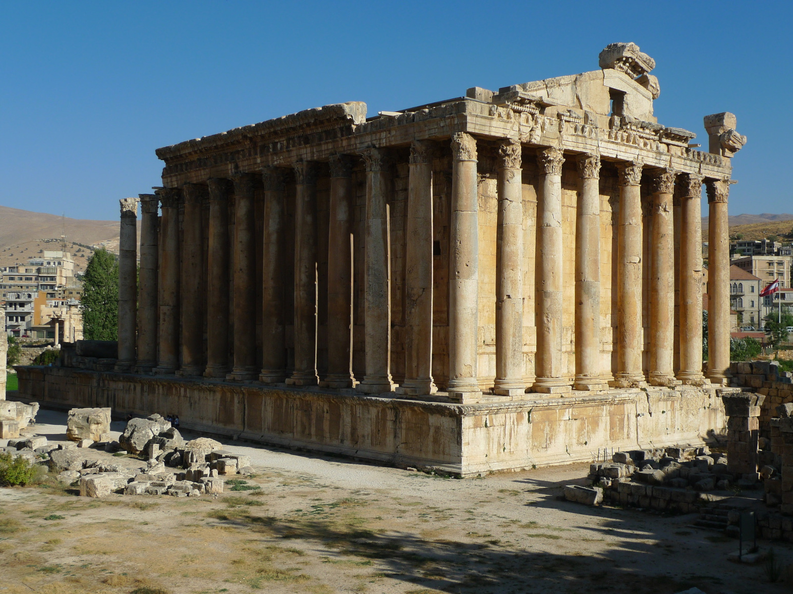 Achevé au IIe siècle après J.-C., le temple périptère de Bacchus, de presque 70 mètres de long est l’un des plus grands et des mieux conservés du monde romain. Il est précédé d'un autel où l'on pouvait sacrifier ovins et bovins. Comme dans le temple de Jupiter, on y pénètre par un escalier monumental, Derrière la cella, un escalier mène à un adyton où trônait la statue du dieu. De nombreux ornements et décors évoquent le culte du dieu de la vigne et du vin, Bacchus ou Dionysos.